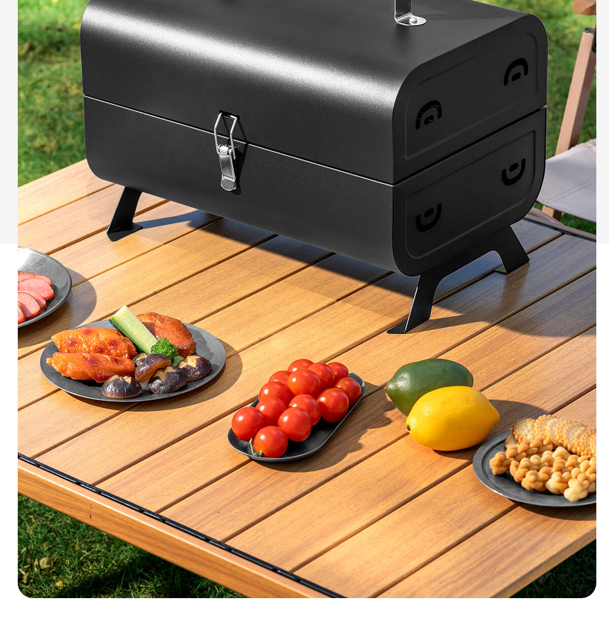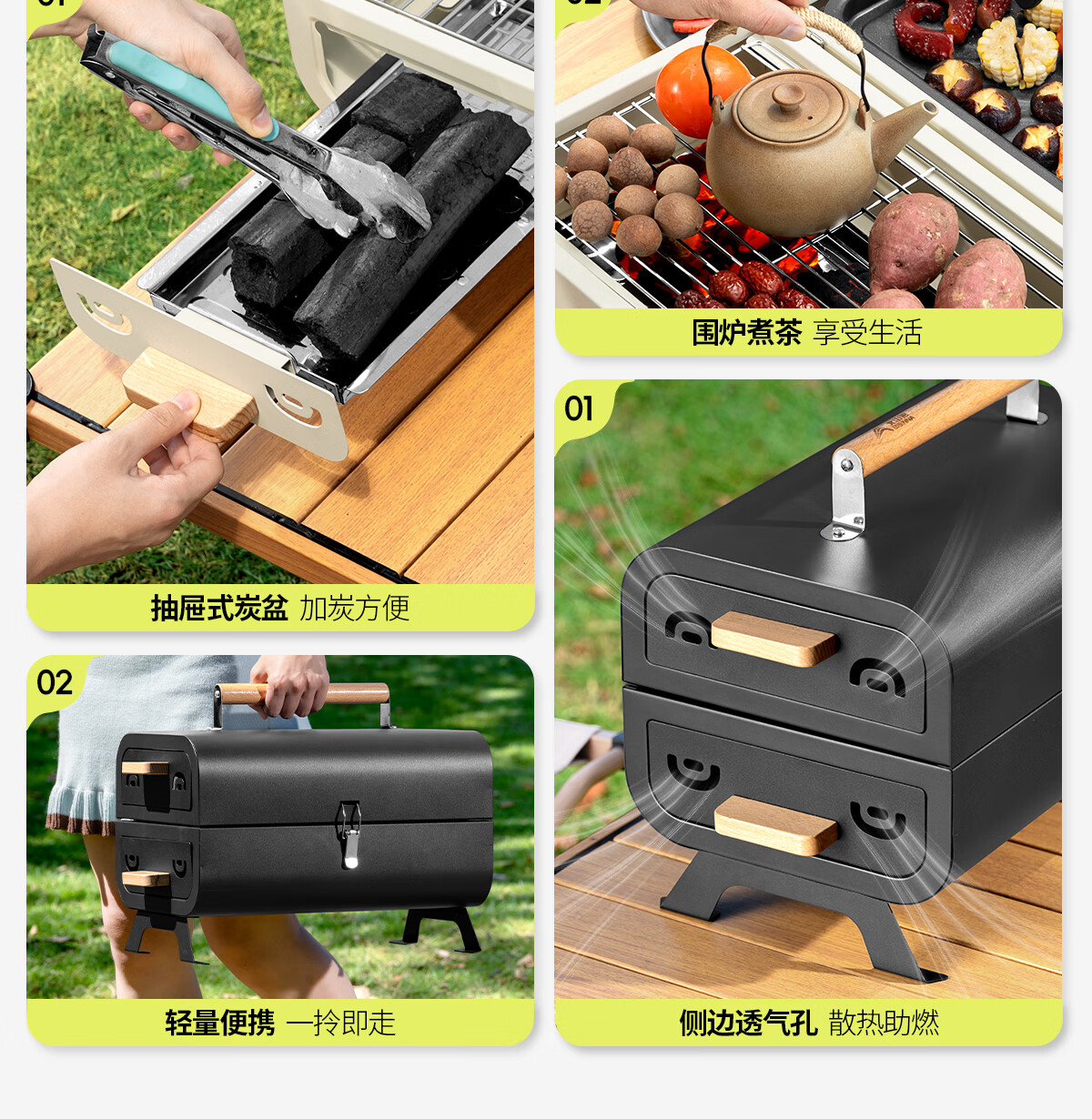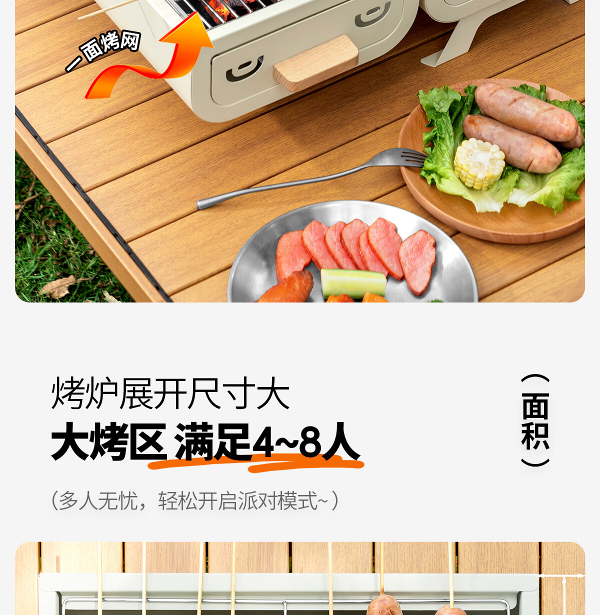 一体两炉,折叠起来一提就可以走,很方便,自带烤架和烤盘,同时生火的话可以一边烧烤一边炒菜,烧菜速度666的。推荐购买黑色,因为高温还是会影响炉子的外壳的。