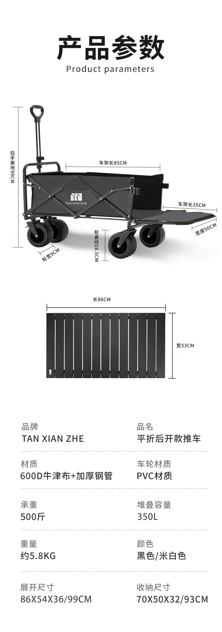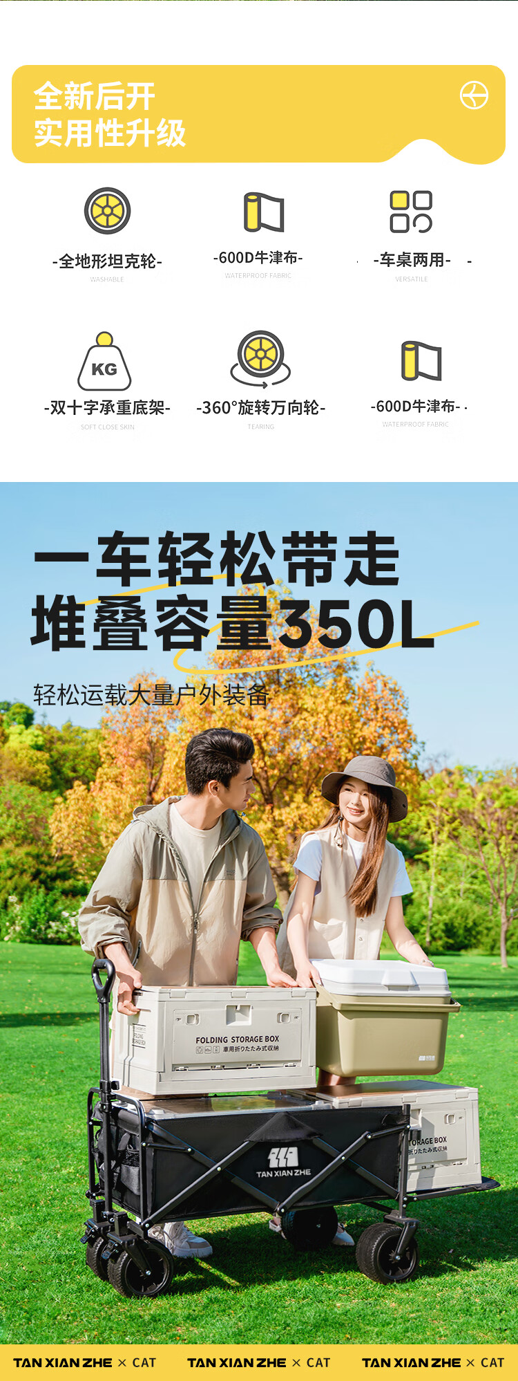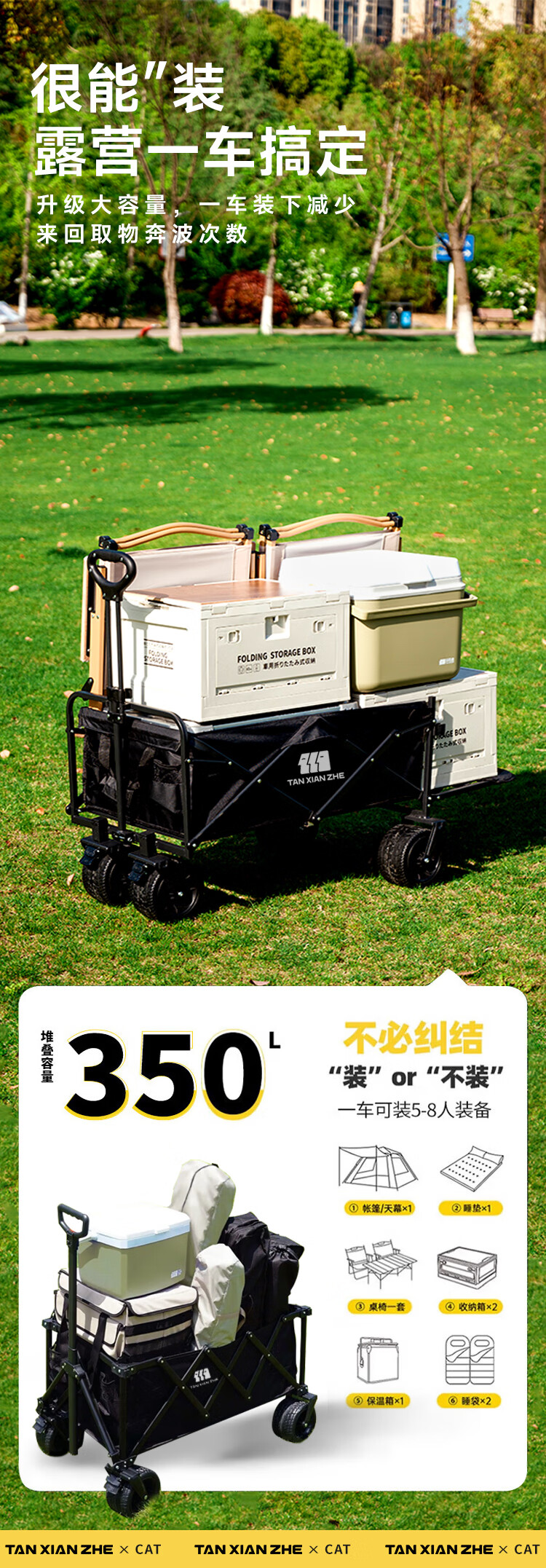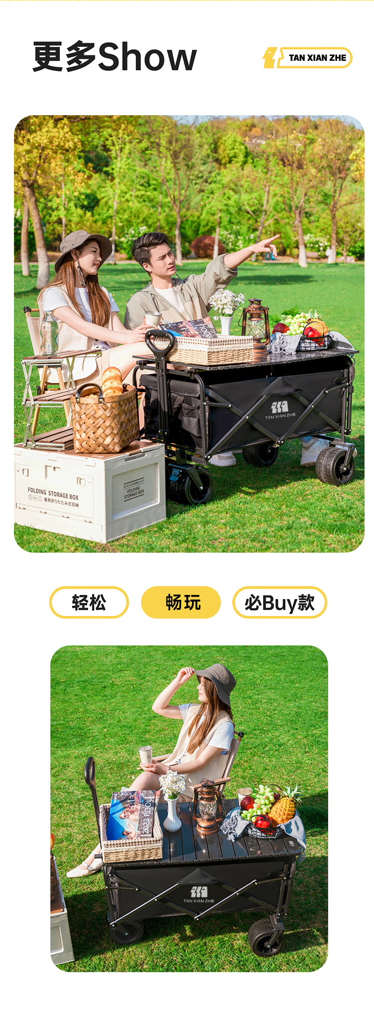 探险者(TAN XIAN ZHE)露营车坦克轮带桌板露营车户外折叠特大号快递车小拖车野餐拉车 350L 曜石黑后开坦克轮+桌板