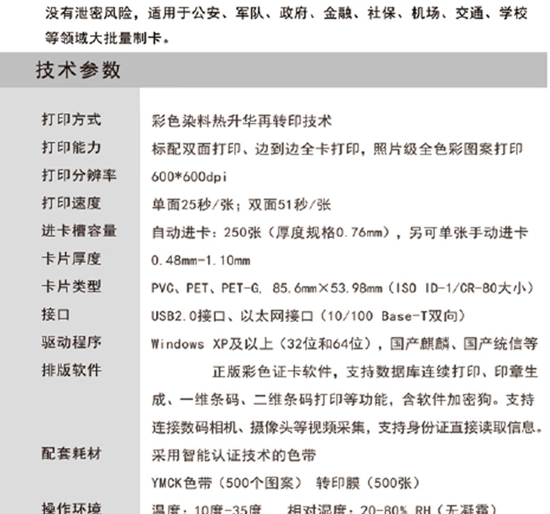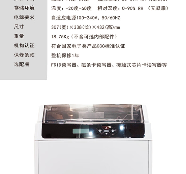 高清600dpi双面证卡打印机*1,USB数据线*1、电源线*1、出卡盒*1、正版软件*1(带加密狗),驱动光盘*1.