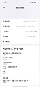 心心念念的小米17pm收到了,大小合适,灵动岛背屏很 有意思,拍照满分,买的16十512,再也不用担心没有内 存空间的问题。运行速度和待机都满分,还有很多小玩 法慢慢研究。