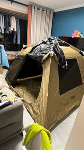 帐篷支起来非常简单快速,三分钟搞定,天幕也就是第一次需要绳结打扣,之后把绳子收好就可以非常快速完成了,帐内空间大,四个大人躺平完全没问题,坐着可以更多人,天幕也完全够移用