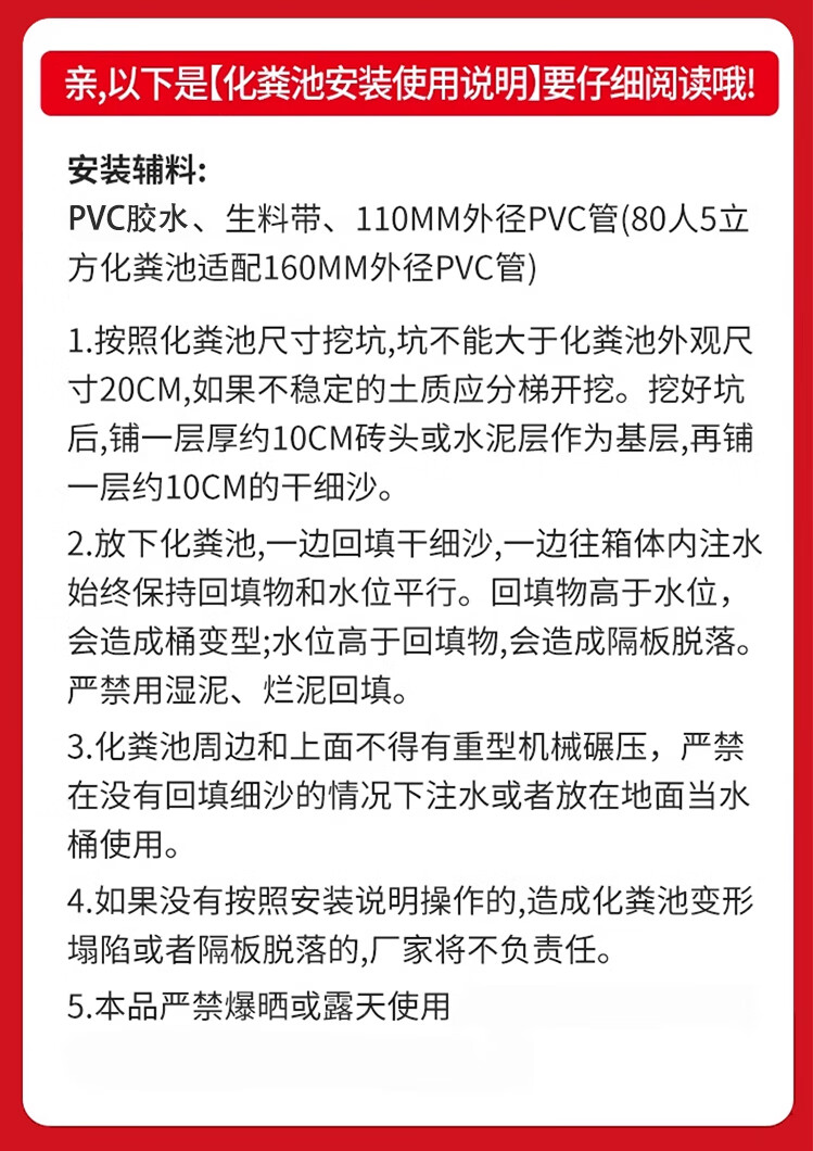 成品化粪池收到了,很厚实,虽然表面有点磨损,但丝毫不影响使用,买了个体积大的,估计五六年不用清理,省心了。