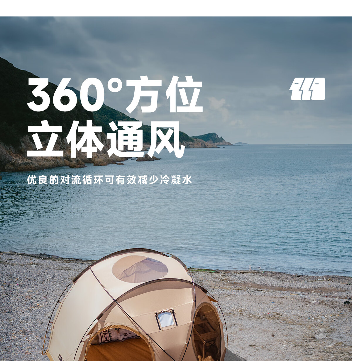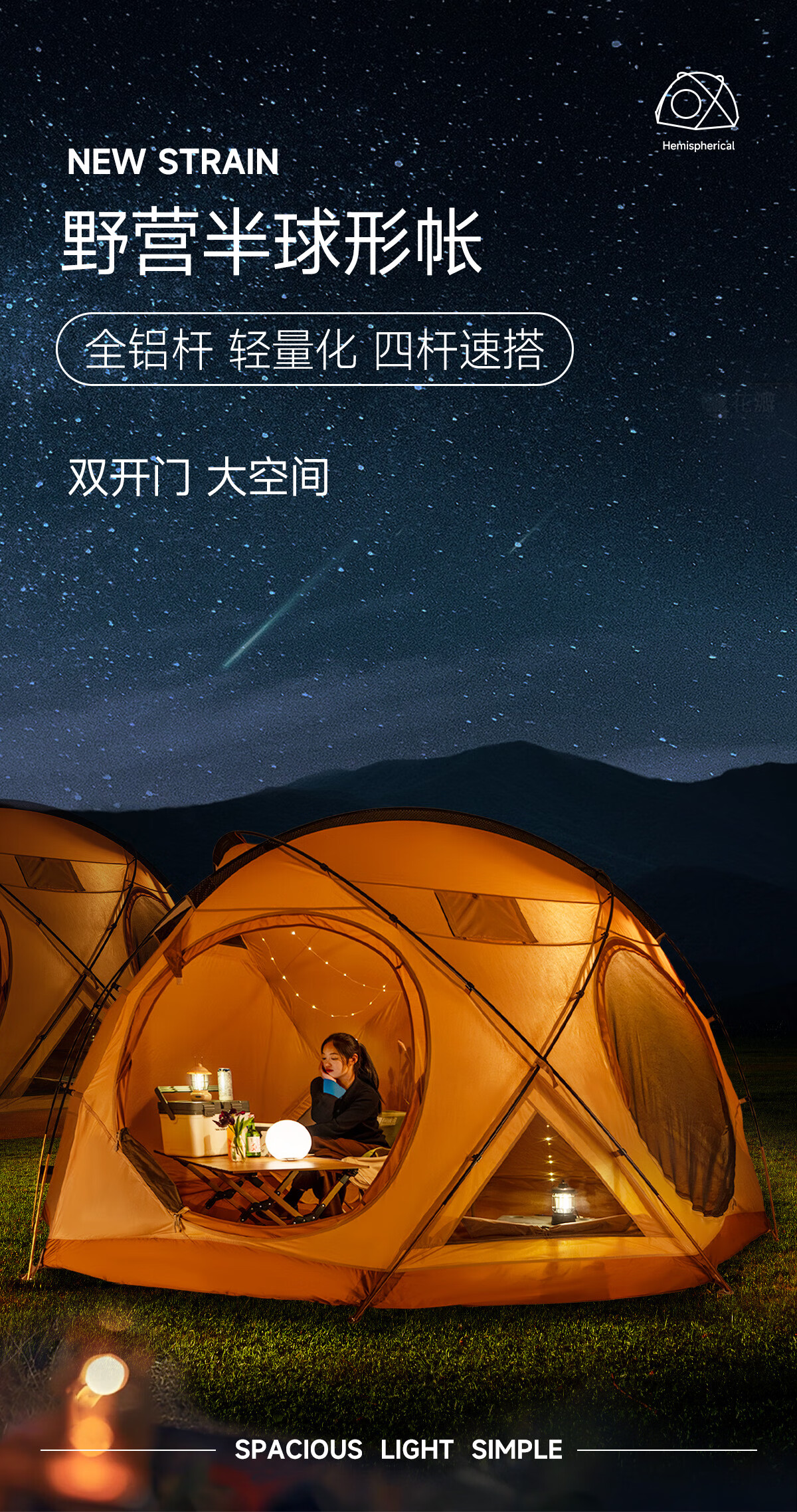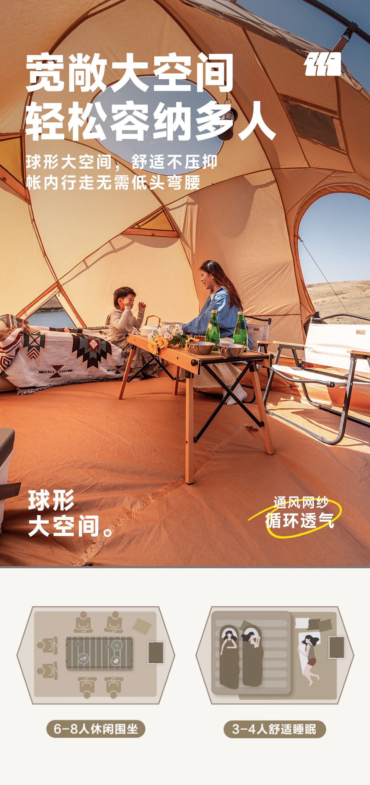 帐篷收到啦 怪不得叫球帐 外观就跟个半球体一样 科技感十足 空间很大 人在里面是可以站立的 一米九左右高度