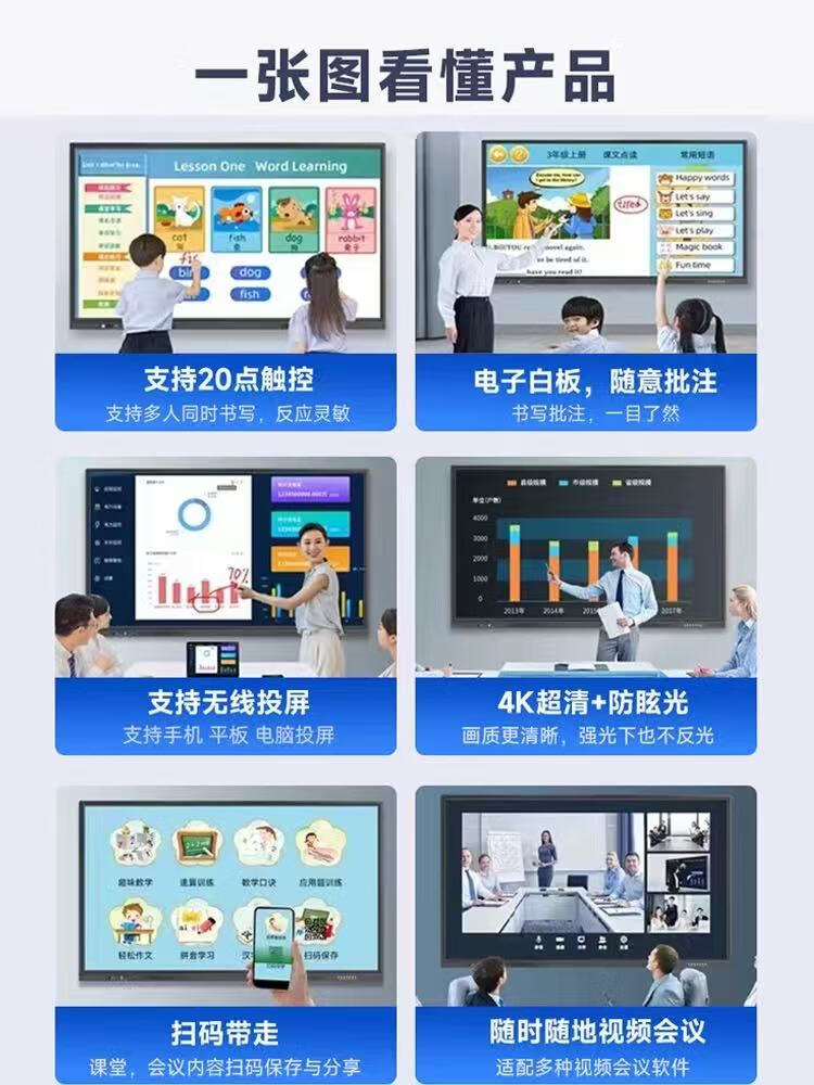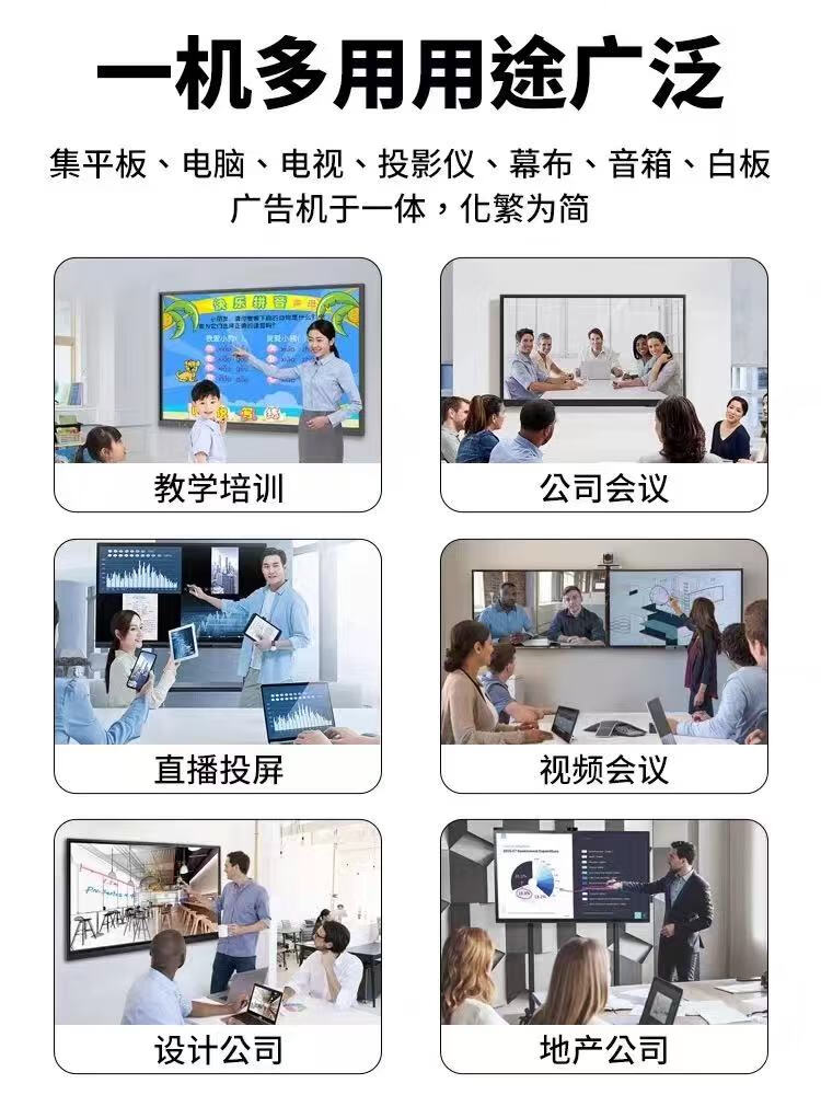 系统流畅不卡,屏幕够大,在10人左右的会议室能看很清楚。手写笔书写流畅。屏幕分辨率高,一般用于腾讯会议开会和共享ppt文档,以上功能就够用了。还能直接上网查询,播放视频都没有问题。安装的师傅比较专业,来的很及时,半个小时就可以全部装好。推荐购买。