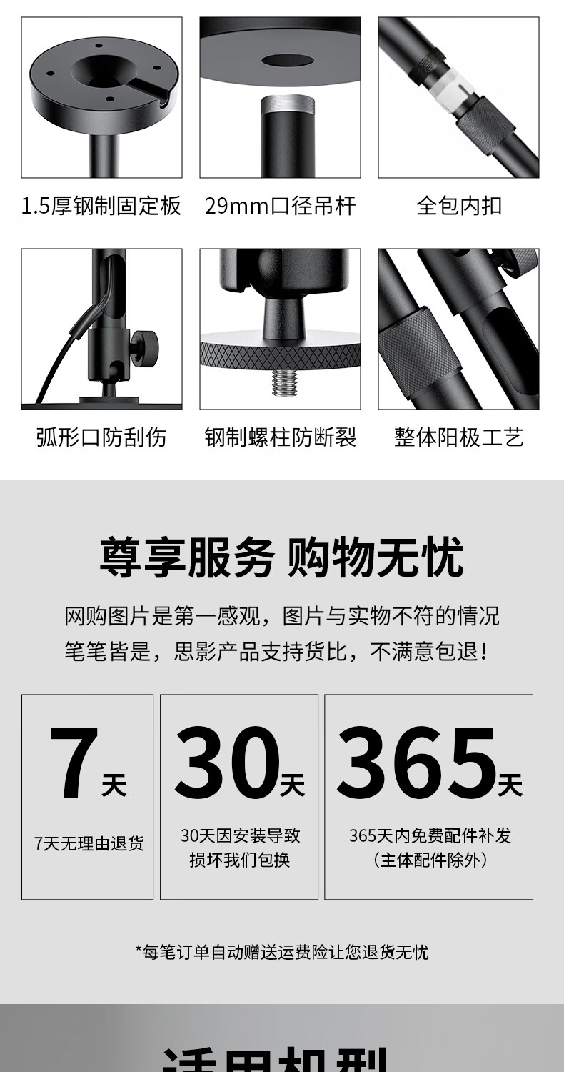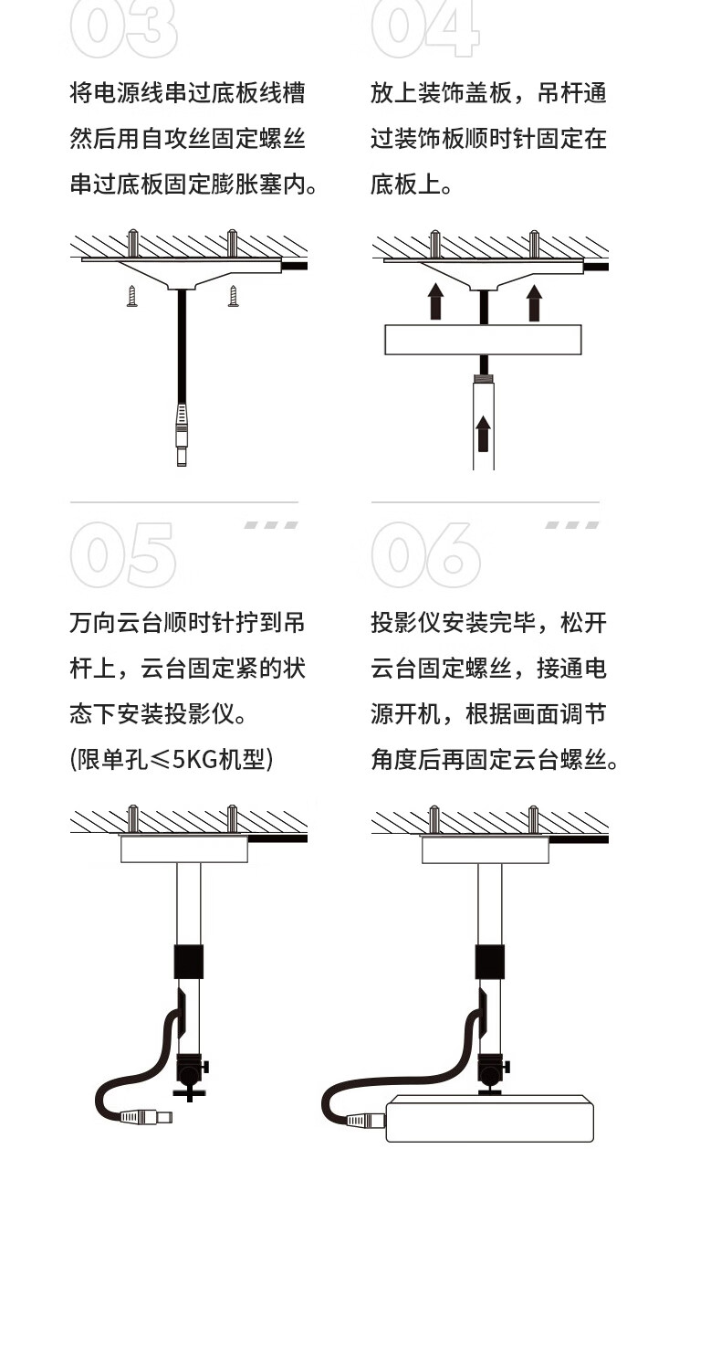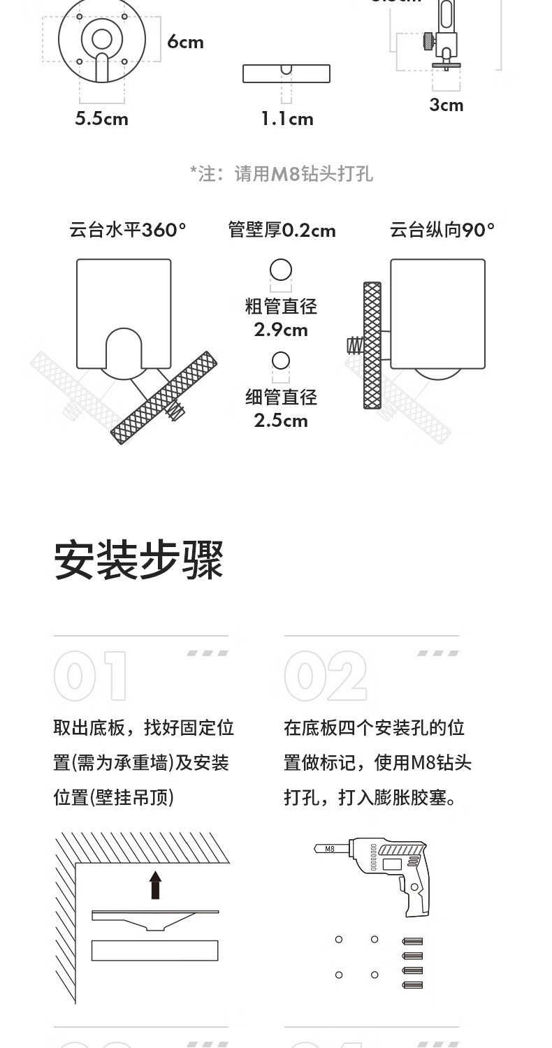 固定板*1、固定盖板*1、吊顶伸缩杆*1、云台*1、塑料膨胀管*4、螺丝*4