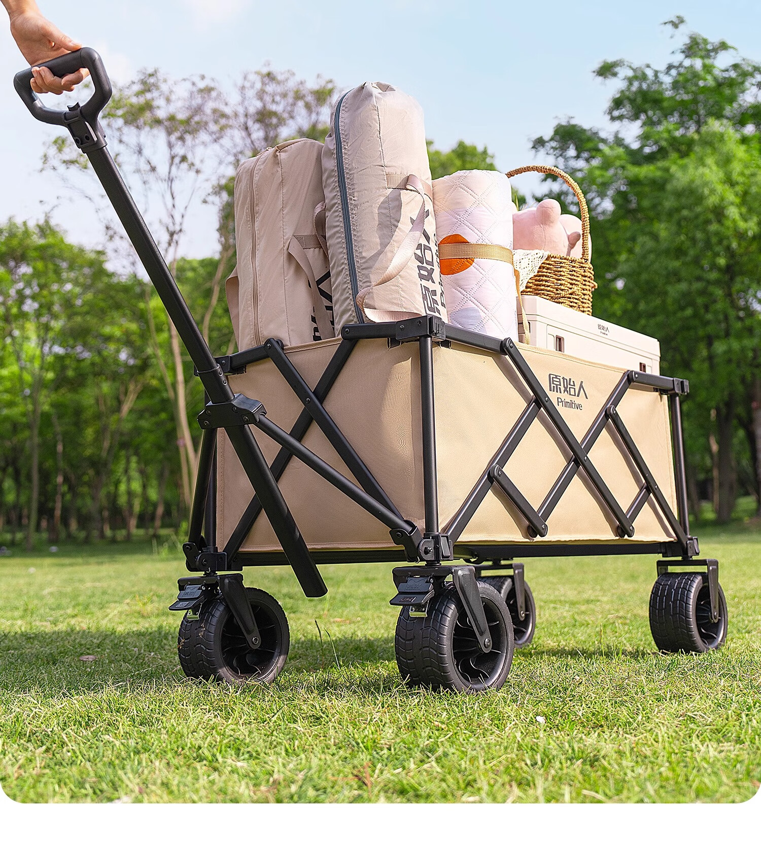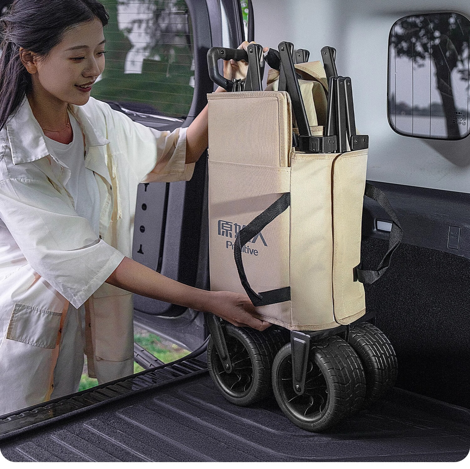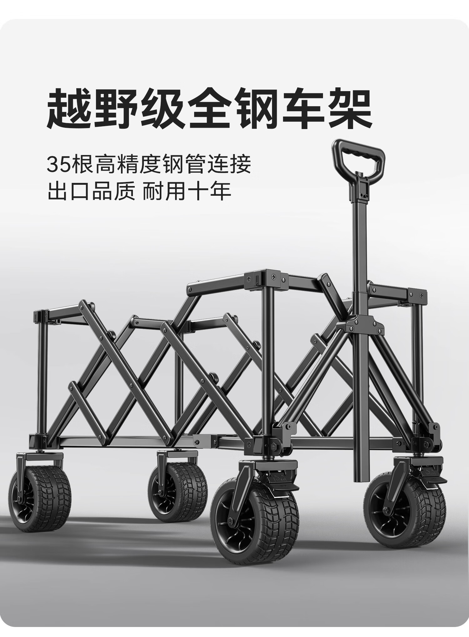 原始人露营推车营地车超大铝合金户外折叠野营野餐桌板遛娃手拉车拖车 220L 曜石黑【10cm宽轮+双刹车】