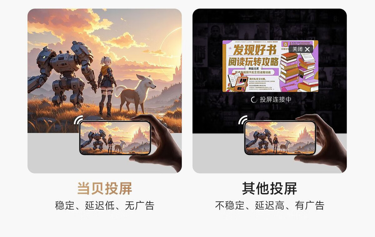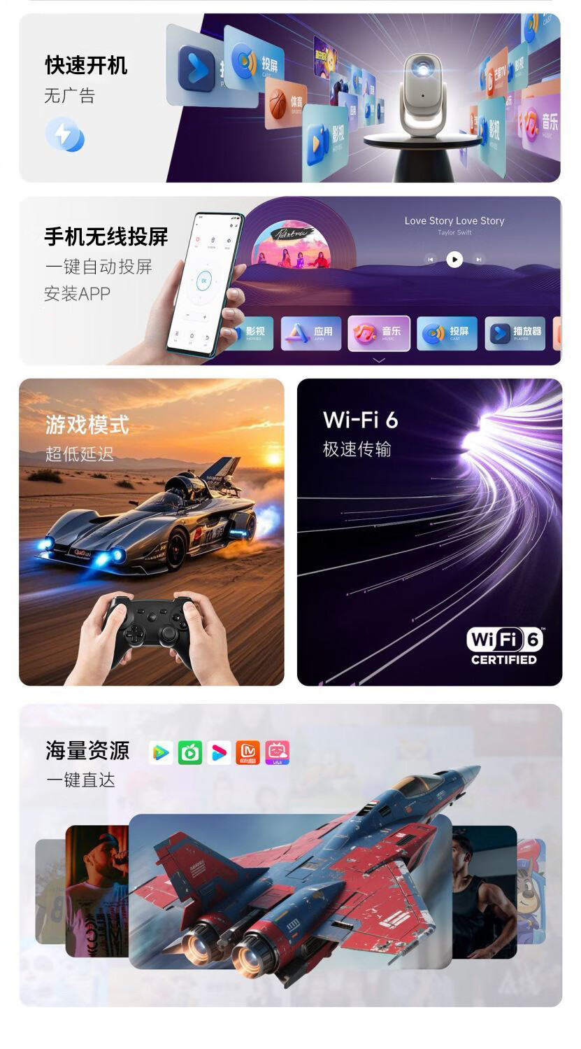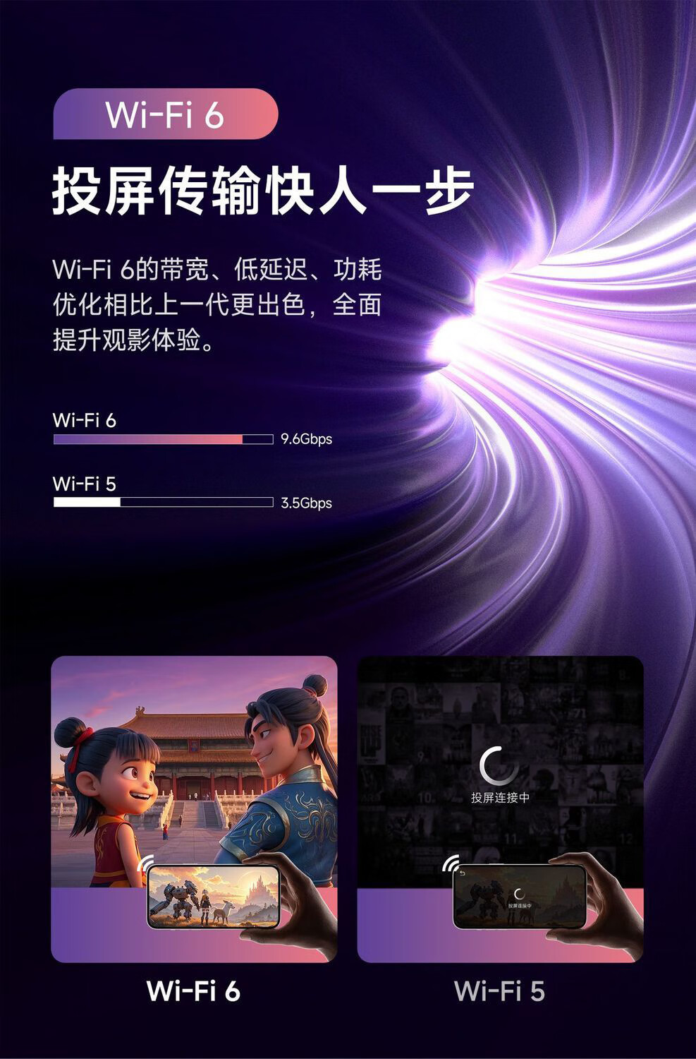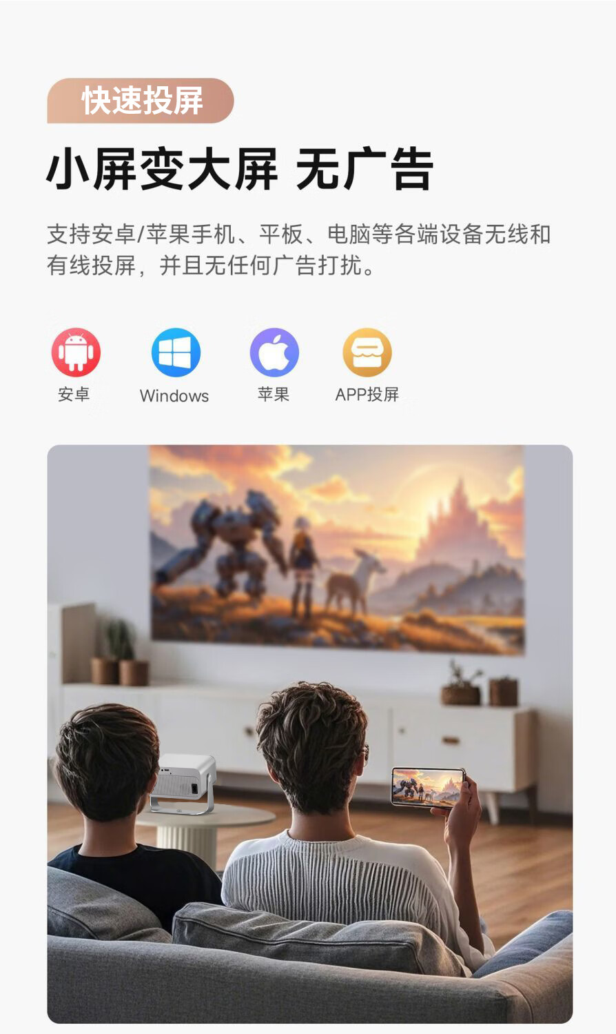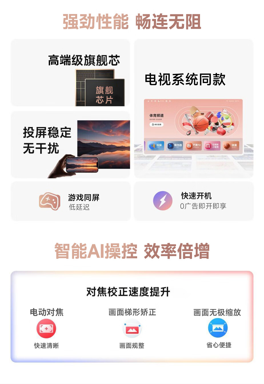 投屏流畅,运行稳定,画面清晰 色彩饱满,安装方便,功能很全面 还能连接电脑,播放画面顺畅,性能绝对优势,音响效果很好