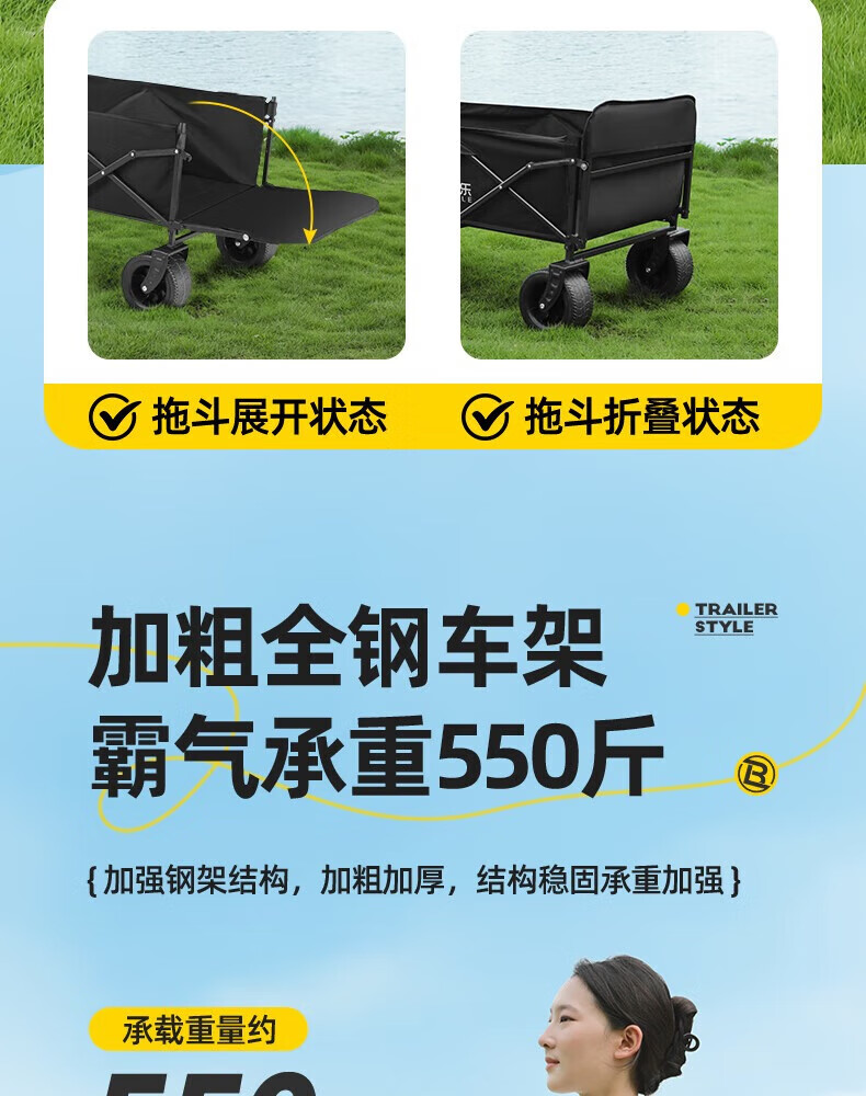 出门买菜拎东西很重手疼,在网上看到了这款露营车。下单之后第二天就到了,包装精美,车子很有质感,很结实。出去买菜逛街再也不担心拿不动