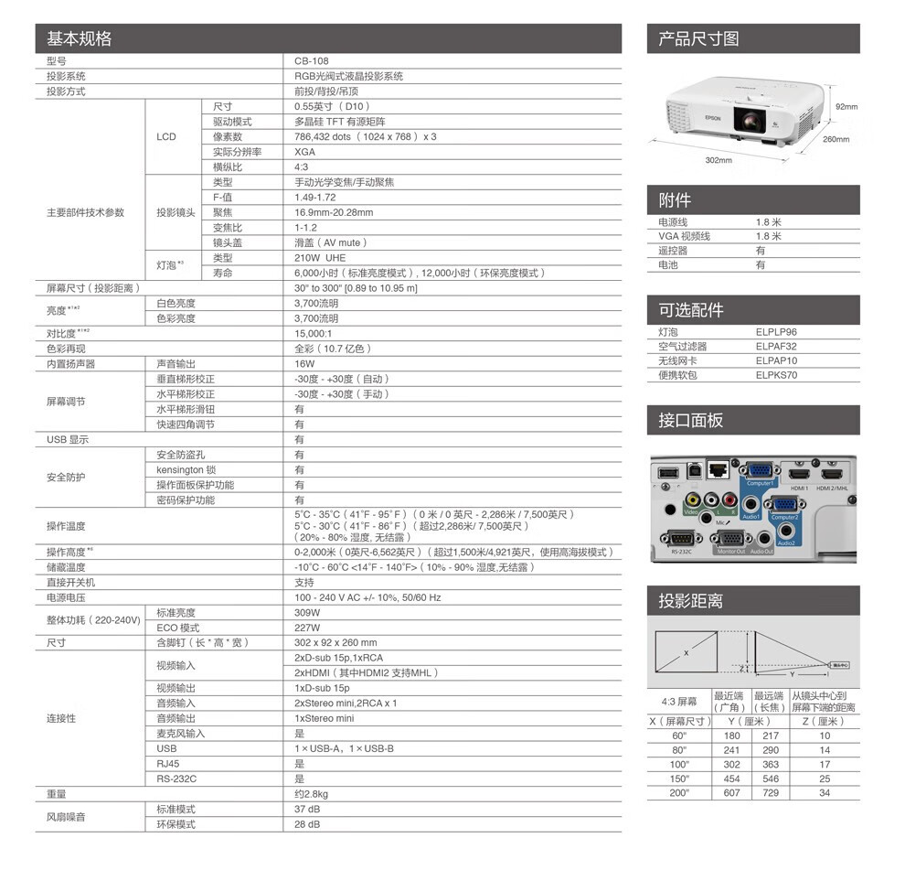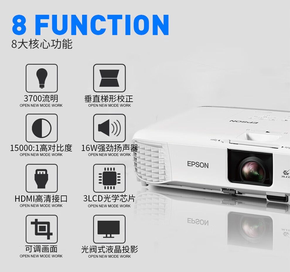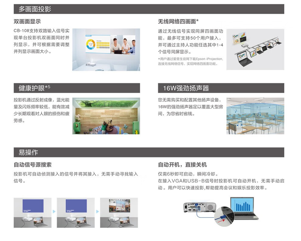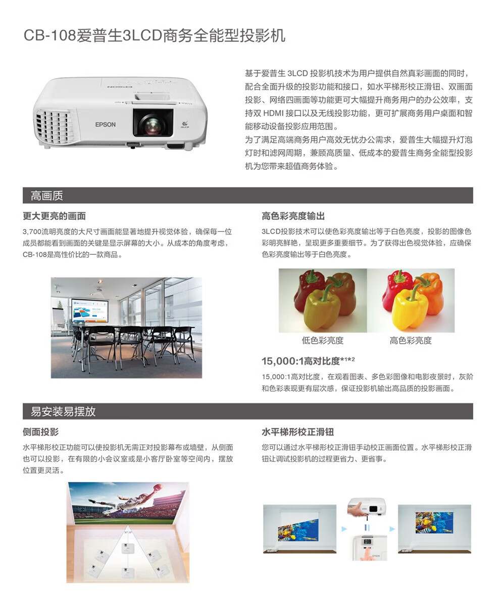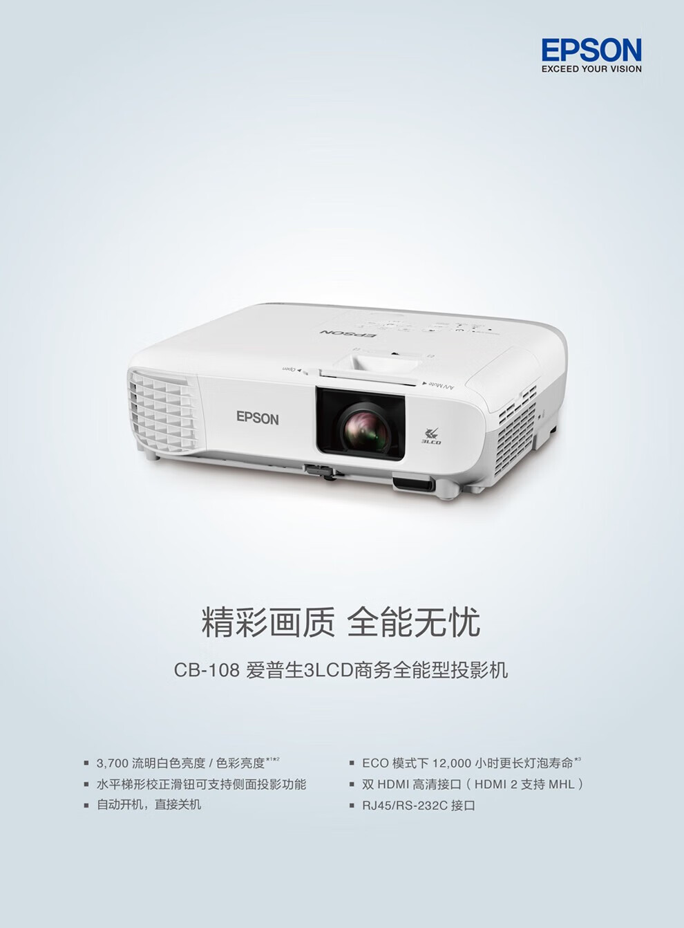 爱普生办公家用投影仪CB-X39 108 X05高清4K无线1080P商务投影仪机 CB-108(3700流明 商务办公)