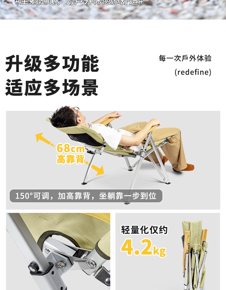 这把海狗椅非常舒服,个人认为完美平替雪峰椅,它椅高适合小腿弯度舒适,椅背宽度舒适大个子大体重都做到不夹肩,铝合金件样式时尚,接口结构稳固牢靠。承重布料厚实。椅背三档调节从正坐到仰躺,冲茶、看书到小憩。轻量化需求不太符合,较大需手提袋,不适合徒步骑行,但非常适合4+2出行。