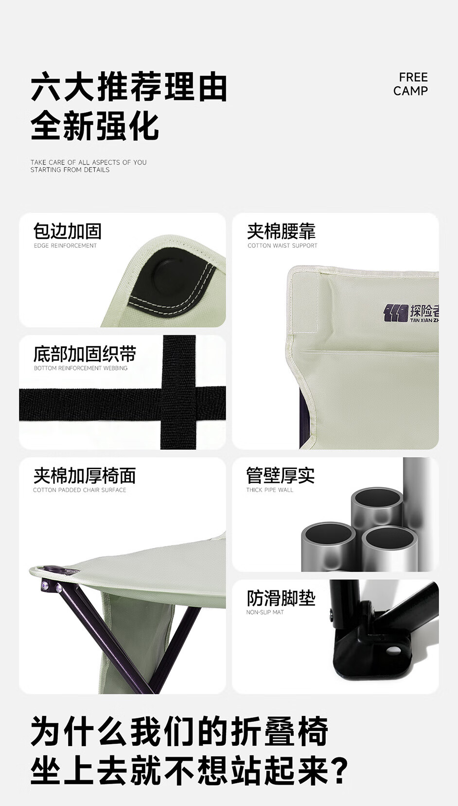 探险者折叠椅,大小合适,放在收纳袋里拿着外出也很方便。不用了放在家里也不占空间,轻便易携,材质扎实,户外居家都好用,值得入手!