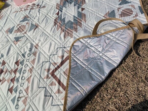 花色很清新,反面是银色防潮膜,摸着中间是软的,铺草地上应该不会太硌。双面防泼水,躺着挺舒服的,三人是一点问题也没有