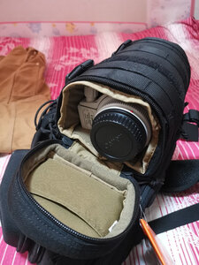 首先品质没的说,确实很好,配合危机4的单肩包很好,外挂系统就是好,可以实现完美的扩展,包包比较厚,内里很柔软,保护性能应该不错,内空可以装下一个小白,但是带遮光罩装进去和拿出来就比较费力了,如果不带遮光罩还是比较好拿取,如果比小白粗的要取脚架环,再长一点的镜头没问题。