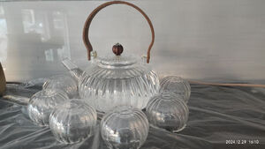漂亮的玻璃南瓜壶,煮果茶,好看实用。6个小南瓜玻璃杯,透明的水晶般亮丽。装果茶,透着水果的本色。大小合适,适合4一6人喝。