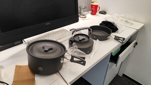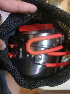 这个小套装收起来仅有一小包,展开后就是锅具三件套,配上酒精炉和防风屏挡就可以在户外喝茶吃饺子和面条了。非常喜欢这个小套装,