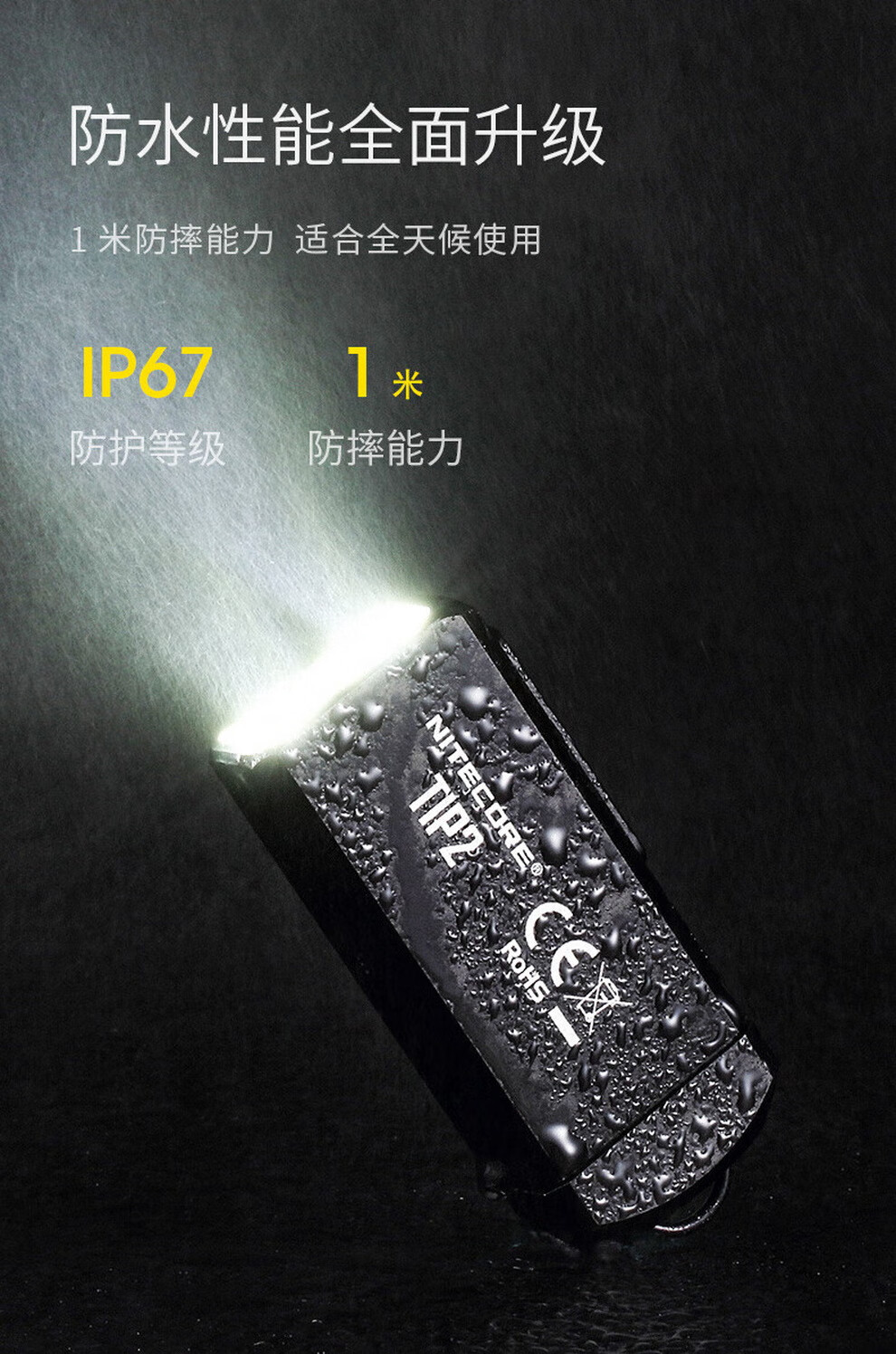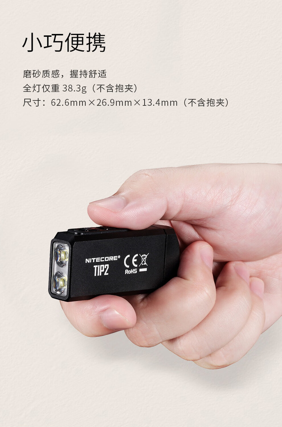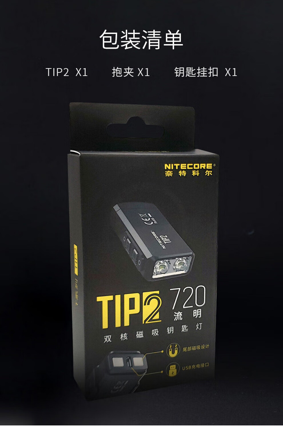 非常喜欢奈特科尔的这些小玩具,TIP2是今年的新品钥匙扣手电,作为TIP的升级版,在体积不变的情况下,改动着实不小。 外壳采用CNC一体化铝合金外壳,让产品档次一下提升了很多,也让防水性大大提升,大幅提高了产品可靠性,让TIP2除了满足日常携带,也能满足一部分户外需求。灯珠增加为2颗,带来双倍亮度提升,在500毫安锂电池的支持下,续航还是不成问题的。包裹性更好的宽抱夹也增加了TIP2的实用性,可以夹在帽子上、包带上使用。最有特色的是磁吸尾部,磁力非常强大,完全不用担心会掉下来,这个设计让TIP2从钥匙扣手电,变成了一只真正的全能手电! 不足,抱夹如果能做成金属的就更好了,虽然说使用上区别不大,但是质感上还有产品档次上,还是希望能配金属抱夹。灯头如果能稍微内陷一点更好,现在完全平齐,磨花的可能性比较大。 这次升级可以称得上是蜕变,很多设计元素亮点满满,更加期待奈特科尔的后续新品了。