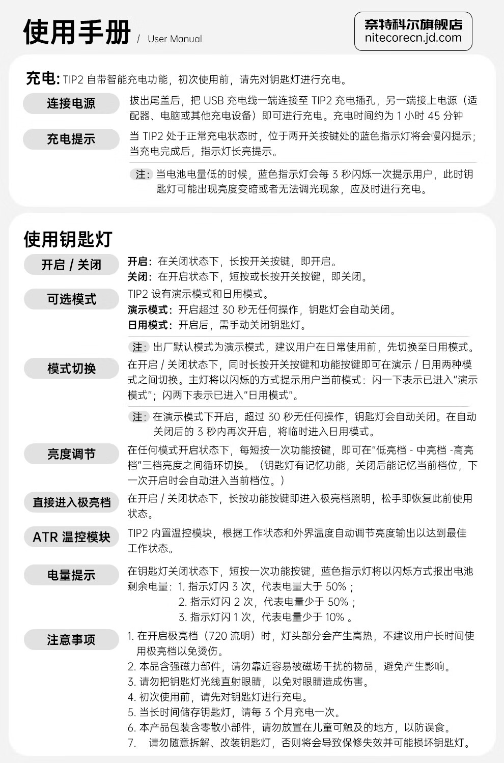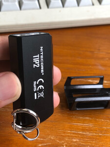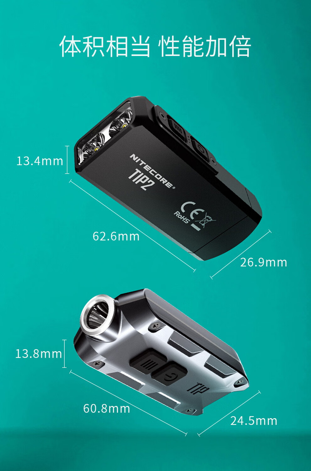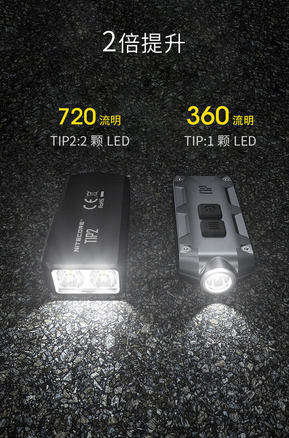 非常喜欢奈特科尔的这些小玩具,TIP2是今年的新品钥匙扣手电,作为TIP的升级版,在体积不变的情况下,改动着实不小。 外壳采用CNC一体化铝合金外壳,让产品档次一下提升了很多,也让防水性大大提升,大幅提高了产品可靠性,让TIP2除了满足日常携带,也能满足一部分户外需求。灯珠增加为2颗,带来双倍亮度提升,在500毫安锂电池的支持下,续航还是不成问题的。包裹性更好的宽抱夹也增加了TIP2的实用性,可以夹在帽子上、包带上使用。最有特色的是磁吸尾部,磁力非常强大,完全不用担心会掉下来,这个设计让TIP2从钥匙扣手电,变成了一只真正的全能手电! 不足,抱夹如果能做成金属的就更好了,虽然说使用上区别不大,但是质感上还有产品档次上,还是希望能配金属抱夹。灯头如果能稍微内陷一点更好,现在完全平齐,磨花的可能性比较大。 这次升级可以称得上是蜕变,很多设计元素亮点满满,更加期待奈特科尔的后续新品了。