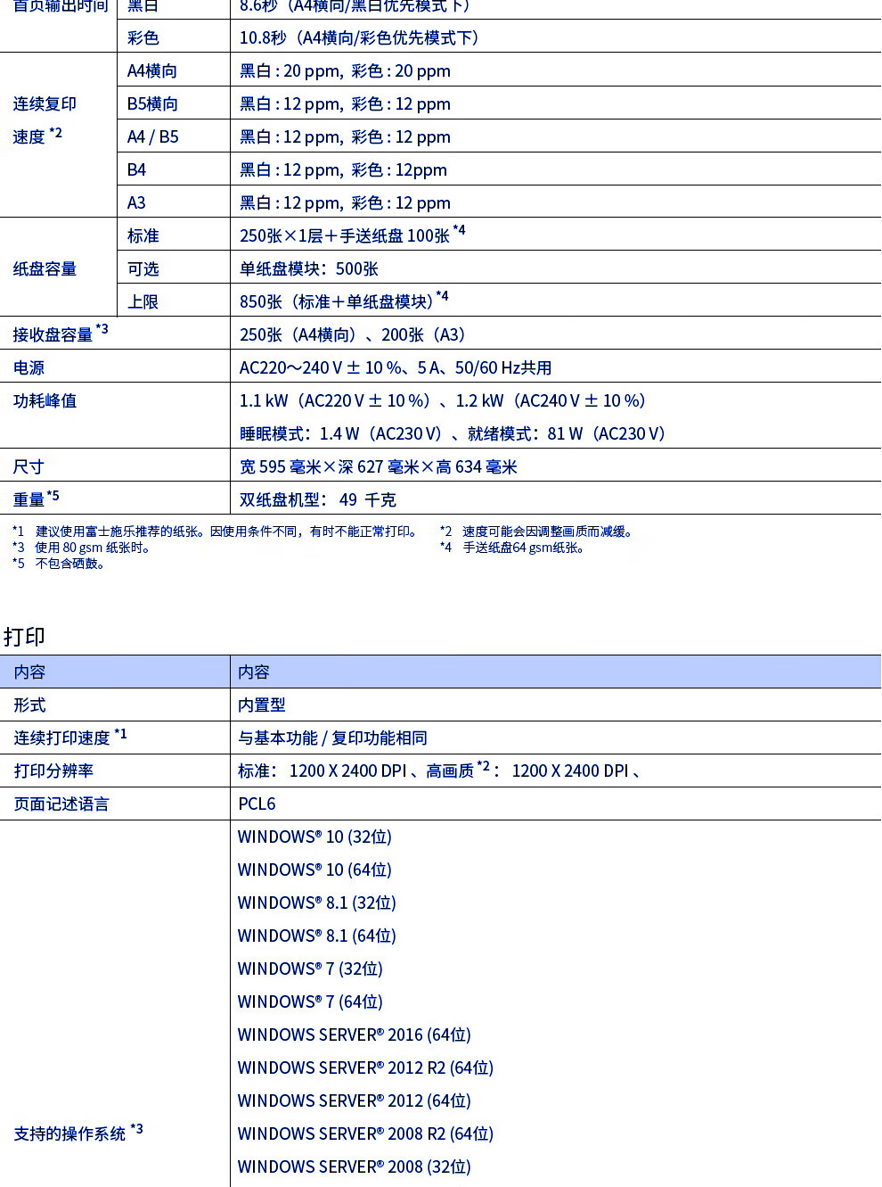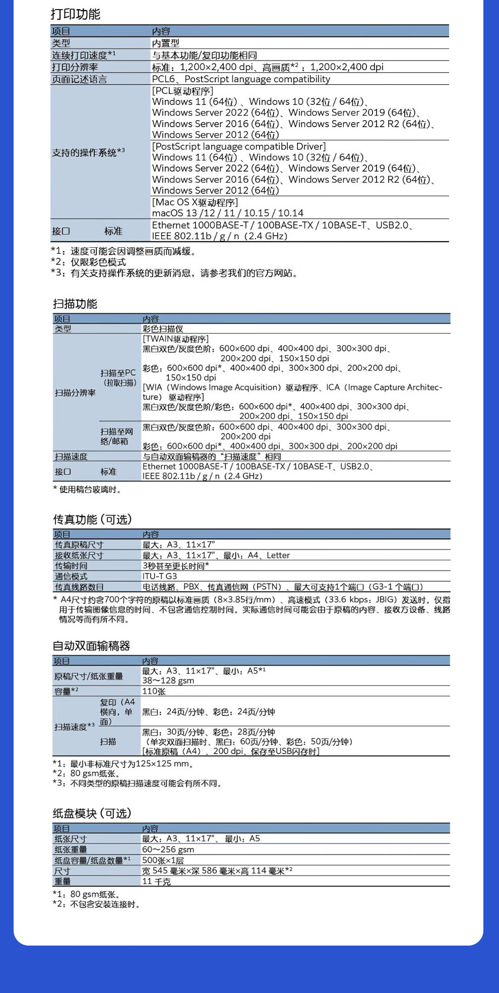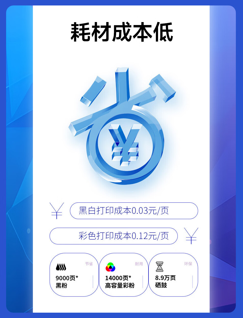 总体还行,加了2号纸盒。原厂只带一个,需要A4、A3手动切换,很麻烦。 打印:速度一般,不知道是不是彩打的原因,感觉双面输稿器速度有些慢。 扫描:最大只支持400dpi。平板和上部输稿器都可以扫描,正常存档300dpi也就够了。 耗材:比同类略贵,标准容量 黑色9000,彩色3000,我多购买了一套高容量粉盒 划下来A4彩打0.4元左右,还算是可以接受吧。 当时没有购买USB款 ,加装也差不多一千,没舍得,后来使用过程中发现很不方便,推荐加装USB 。