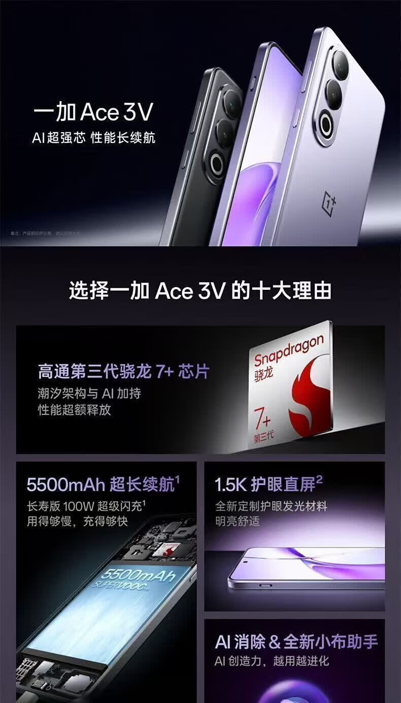 一加Ace3V 5G通 游戏AI拍照学生手机 骁龙7+芯片超长续航直屏 幻紫银 12GB+256GB