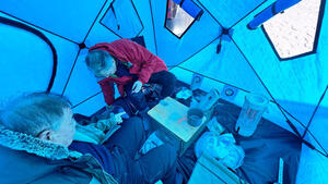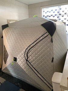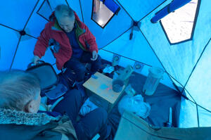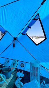 冰钓帐篷做工精细质量杠杠的 在辽西地区冰钓蓬内不用取暖器取暖 在里面不用戴手套钓鱼 太好了