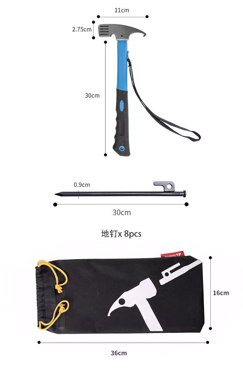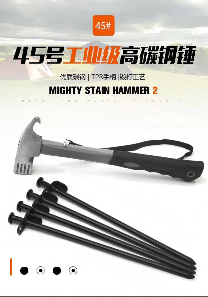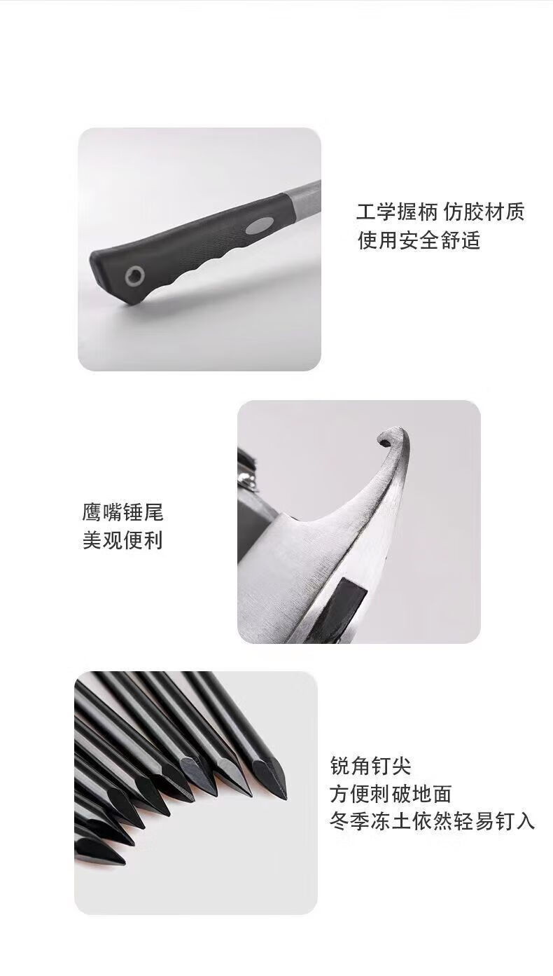 分量很足,手感好,有收纳袋带着方便,实用性强,敲击有力,材质坚固,做工精细,户外必备,设计合理使用舒适,拔钉轻松