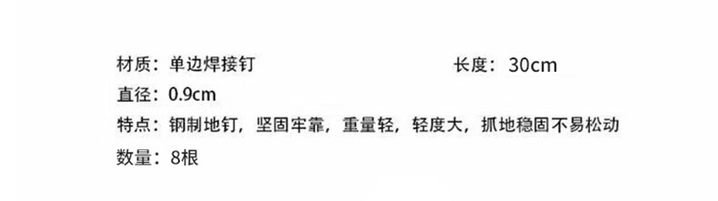 帐篷地钉以收到,跟图片描述的相符,不错!以后外出郊游搭帐篷在也不会用那种帐篷配的不锈钢丝地钉了,商家发货很快快递也很给力,给你们五星好评!
