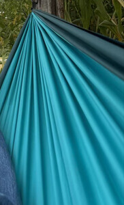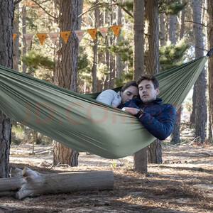 很好用的吊床,重量能接受,尺寸双人用起来很方便,下点小雨,还能反拉过来遮住.颜色也耐脏