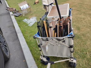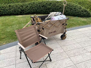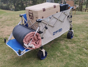 还没出去露营。先式拉了一下,非常好用。车子质量不错,可以当婴儿车也可以户外露营使用,超级大的实心越野轮,轮子顺滑,收起来也可以放车后备箱,不占空间,收纳小巧很轻便。家里有小孩的也可以入手,遛娃神器,赞!