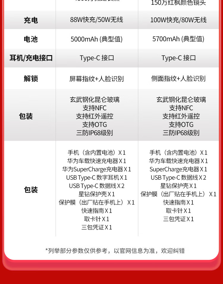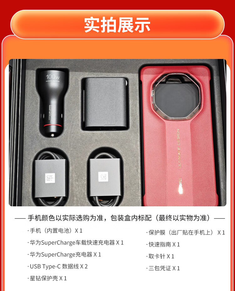 手机(内置电池)*1 华为车载快速充电器*1 华为充电器*1 数字耳机*1 USB Type-C 数据线*2 星钻保护壳*1 快速指南*1 取卡针*1 保护膜(出厂贴在手机上)*1 三包凭证*1