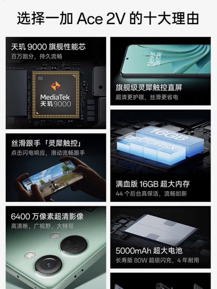 一加Ace 2V 6400万超清三摄 5G游戏手机 天玑9000处理器 Ace2v 青柚 16GB+512GB 单机+原装品牌快充+店保1年