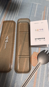 纯钛的筷子和勺子的套装,是空心的,很轻便,用起来不会有压手感,很轻巧。还送了一个塑料的餐具盒子,可以把筷子和勺子一起装起来,非常方便携带,很方便,有盒子餐具就不用放在外面,很好。