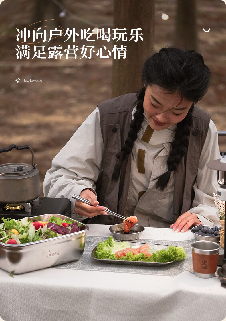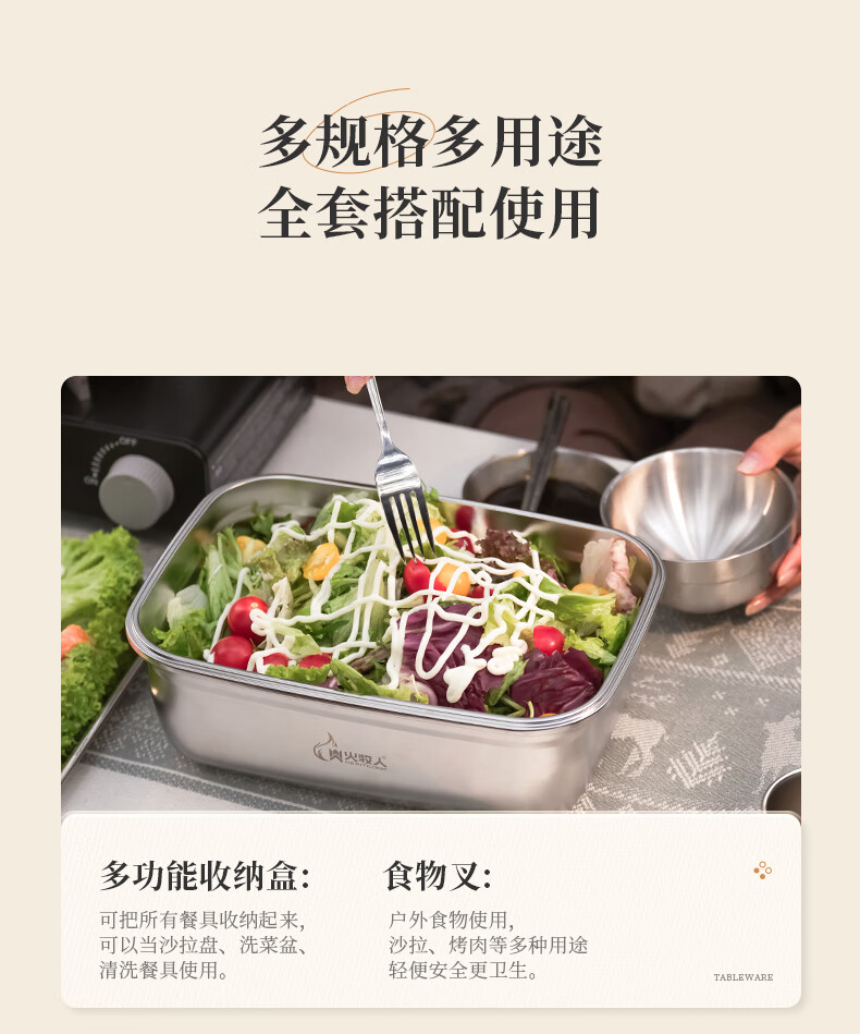 这个火木人的一套还挺方便的,有托盘,还有相当于外壳。作为一个沙拉盆,有四个杯子,四个碗,四双筷子,两副刀叉。嗯,基本上一家出行是够用了的,质量也还是不错
