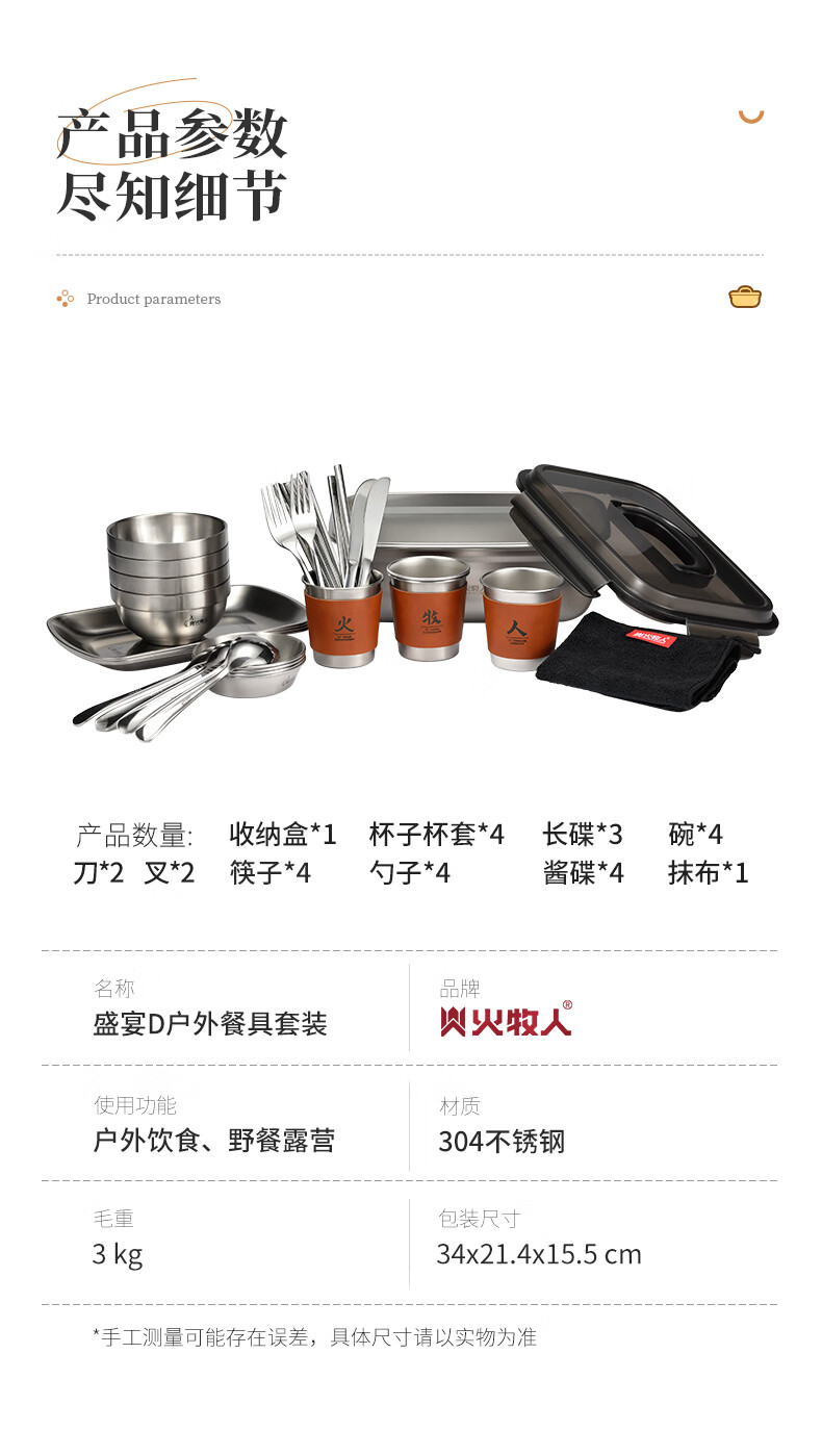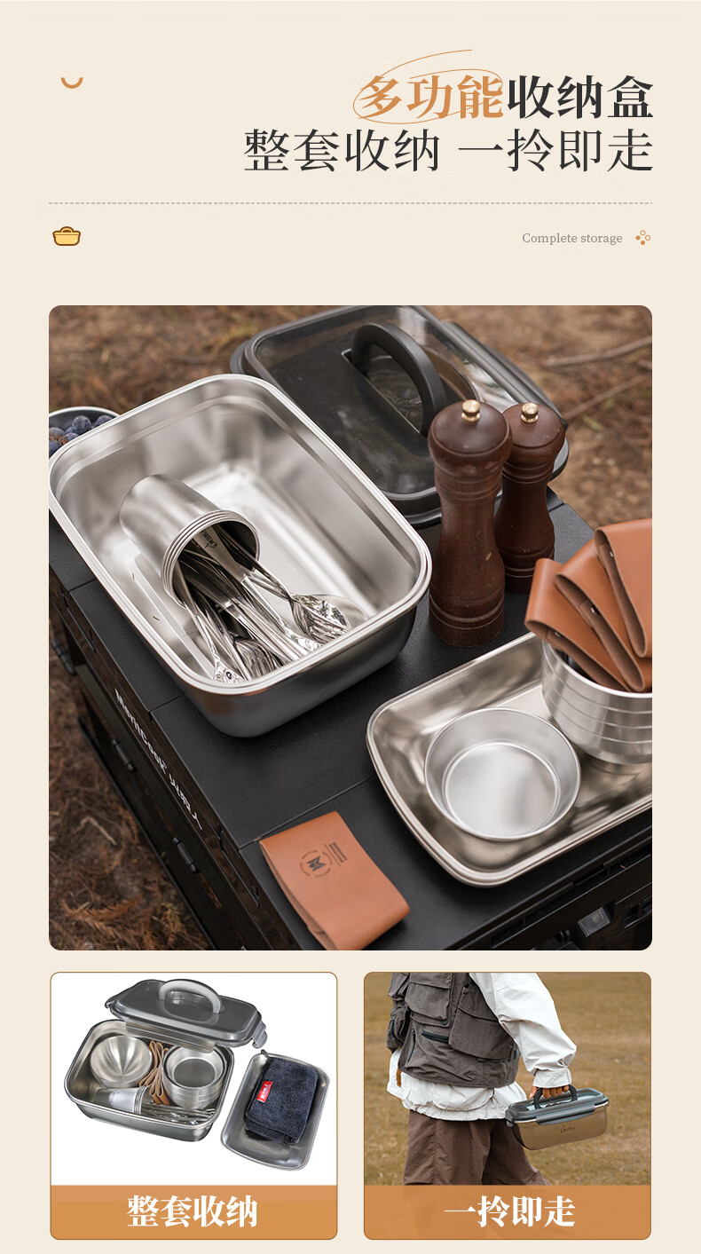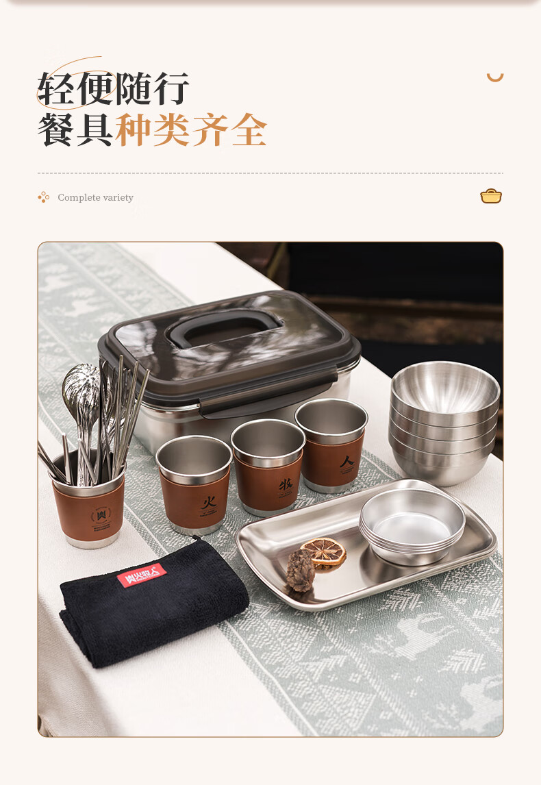 选了这一套户外露营餐具,物流快,包装严密,细致,纸箱内部的四个角也都垫了泡沫,边缘没有磕碰破损。 和商品图一致,实用,便于清洁的套装,做工细节很棒,有质感,304不锈钢材质,碗筷,刀叉,水杯都有了,全部都可以放进收纳盒,套装便于携带,适合户外郊游野餐。