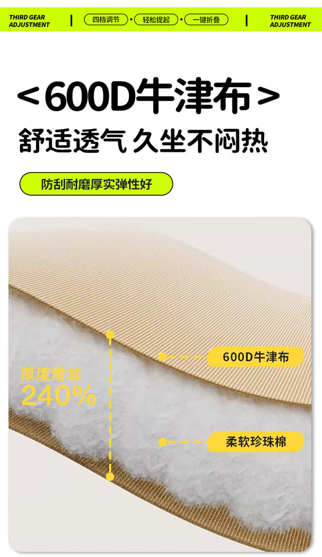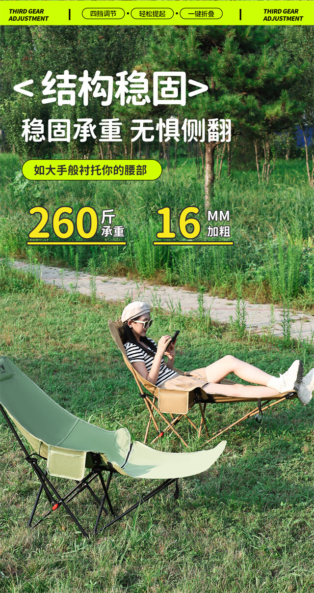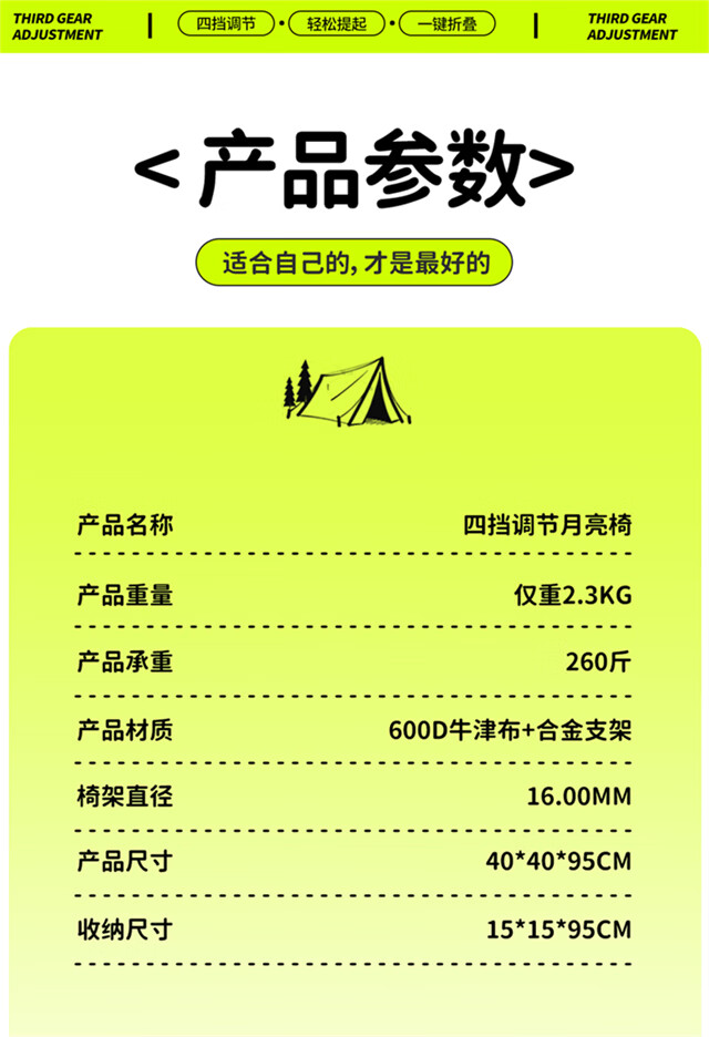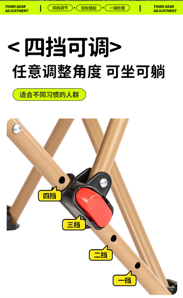 东西还不错,四挡调节挺方便的,坐着很稳当,带出去野餐或者露营都很合适。收纳起来也不占地方,重量轻便,拎着走没压力。材质摸起来扎实,用了好几次也没见磨损。