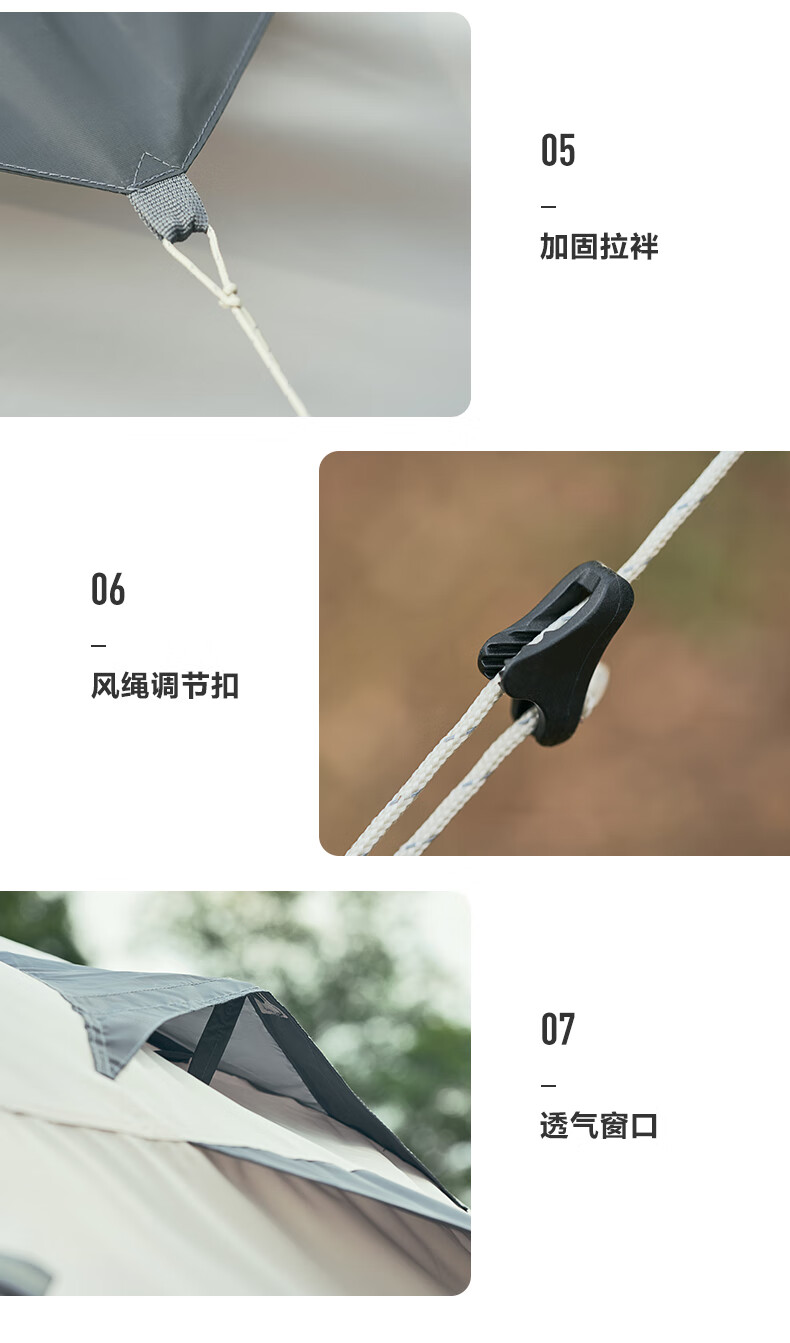 这款户外帐篷真的给露营体验拉满了!拿到手第一感觉就是做工扎实,骨架采用加粗的玻璃纤维杆,支撑力超强,遇到5级大风也纹丝不动,防风性能完全超出预期。帐篷面料防水指数高达3000mm,周末露营突遇暴雨,里面完全没渗水,防潮垫和睡袋都保持干爽,安全感直接拉满! 搭建过程超级友好,说明书图解清晰,我一个女生10分钟就能独立完成。内部空间宽敞,一家三口使用都不拥挤,还有多个储物网兜和挂点,零碎小物件收纳超方便。顶部的天窗设计特别贴心,白天拉开纱网通风采光,晚上躺在床上就能仰望星空,氛围感直接拉满! 收纳起来体积小巧,附赠的收纳袋质量也很好,背着去徒步也不占地方。细节处的人性化设计诚意满满,比如防风绳反光条、透气纱窗防蚊虫,真的是兼顾了实用性和舒适性,绝对是户外爱好者的必备好物,强烈推荐!
