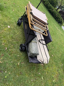 露营车收到了,接着在驿站打开中其他东西了哈哈,轮子粗很稳固,看起来沉重也可以收纳起来也很方便,收纳起来不占地方,总体来说质量很不错,大小我自己感觉还是挺能装的,能装很多露营的东西,小孩也可以做里面,拉起来也挺轻松的,大小品牌还是值得拥有的,推荐