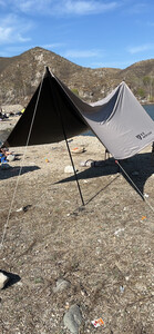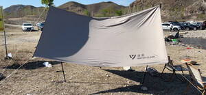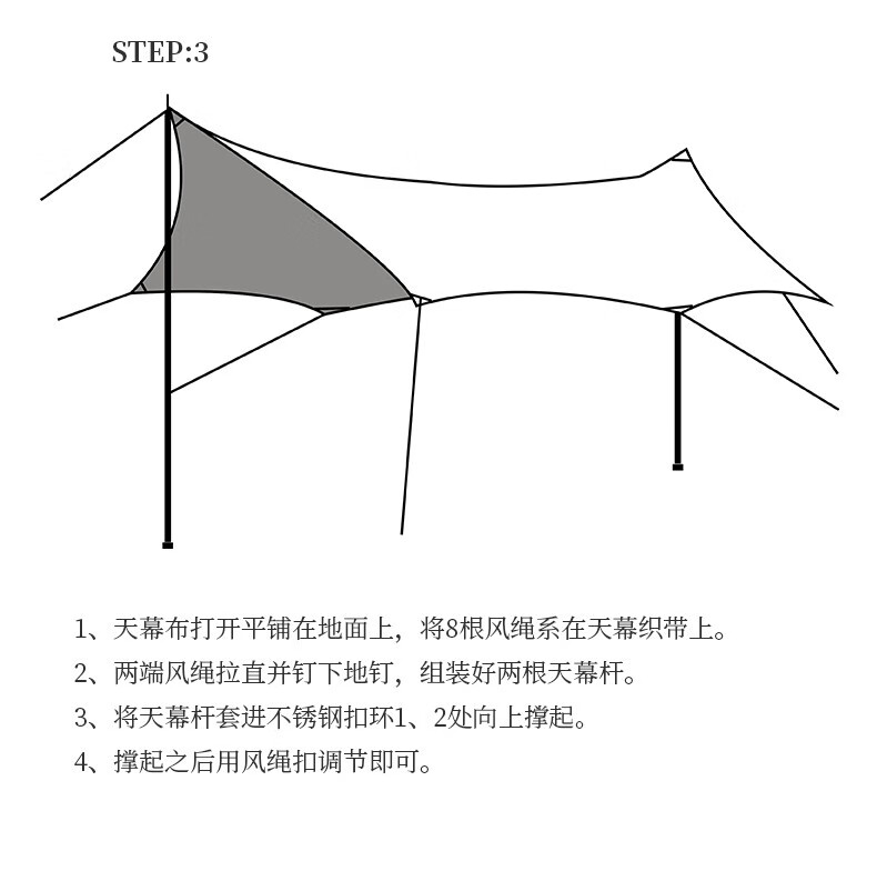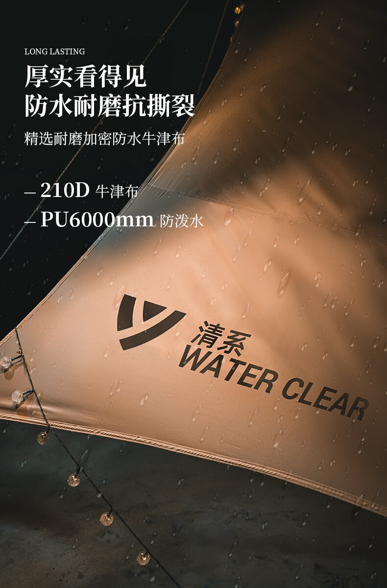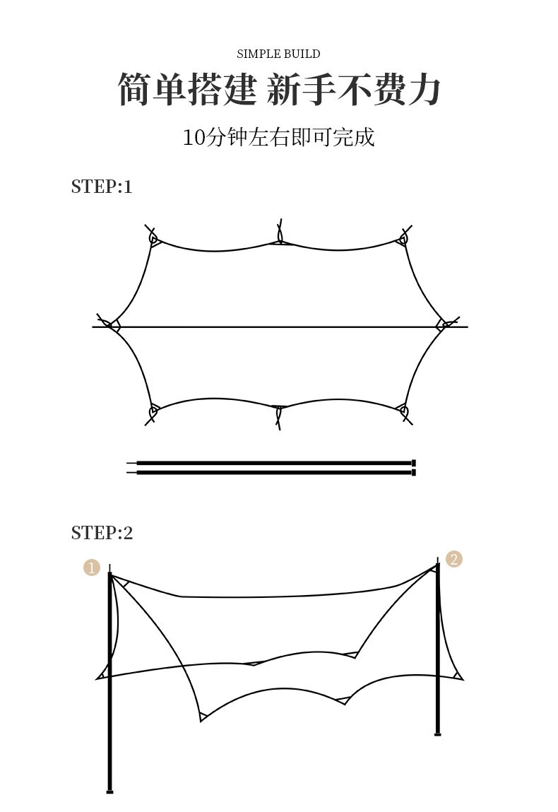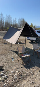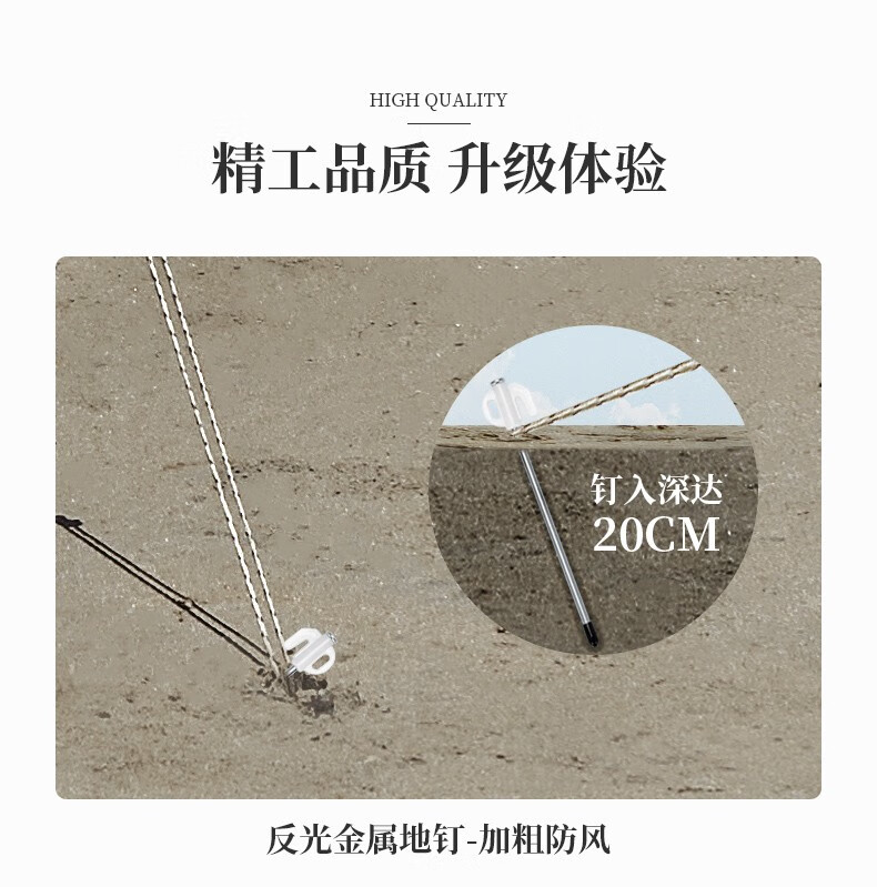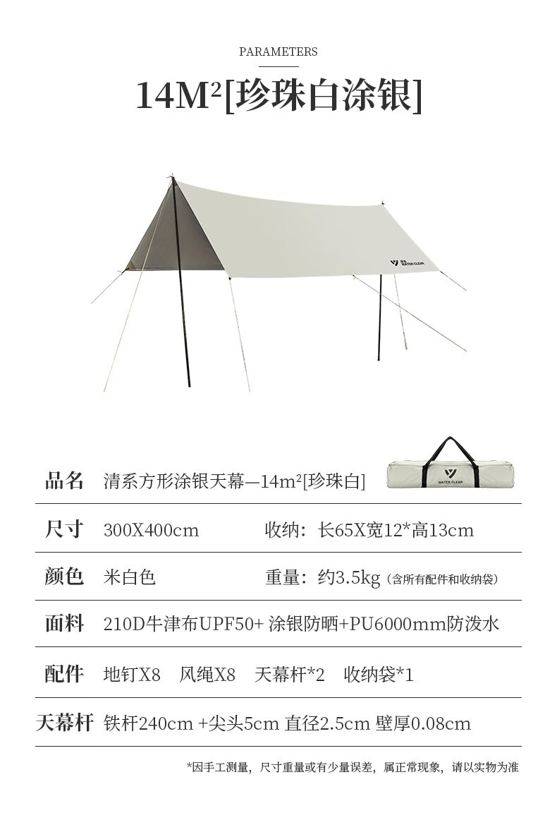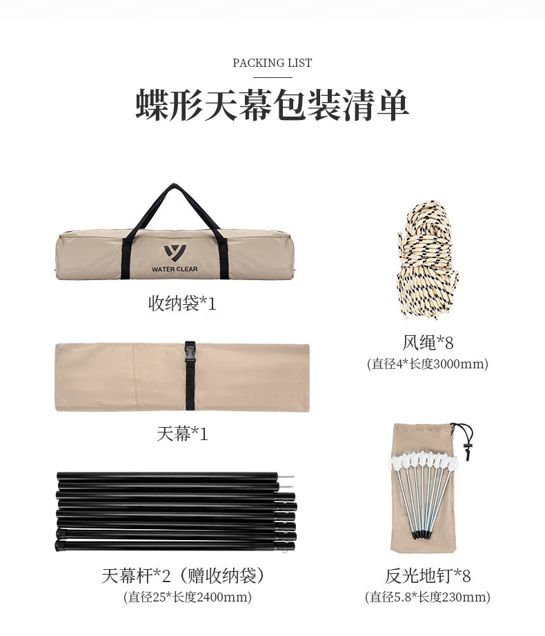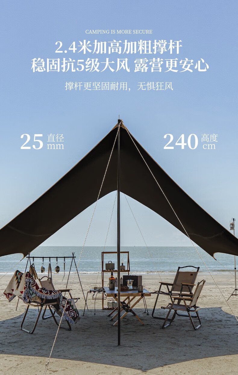 天幕杆组装后不足2.4米,大概在2.1米左右,整体天幕撑开后比较低,需要借助周边建筑物,建议自配天幕杆及风绳,风绳只有6根,中间留有预制绑扣,但没有多余的绳子进行绑定,露营车小且轻,拉装备足够用,椅子轻便,桌子组装方便,客服很有耐心,商品不满给到天幕