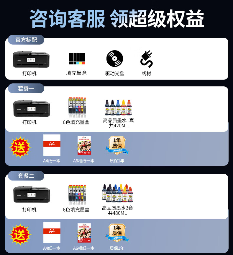 佳能(Canon) TS9580彩色喷墨专业照片打印机相片a3+双面复印扫描一体机不干胶铜版纸名片 TS9580黑色(A3打印+a4复印扫描) 套餐二(填充墨盒 可加墨+500ml墨水)