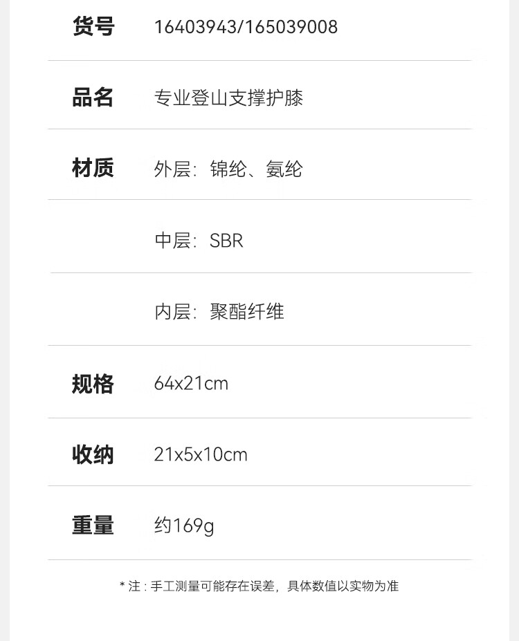 质量很好 产品重量:适中 产品材质:优秀 适用场景:登山徒步的好选择,穿戴容易!准备带着它去雨崩徒步,希望给膝盖带来有利的保护!相信一定能体现出很好的效果!
