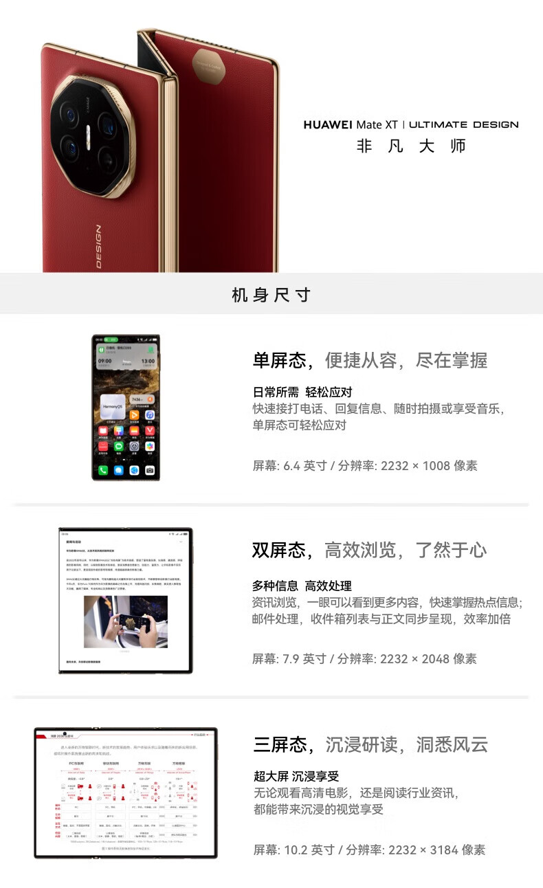 华为(HUAWEI)Mate XT 非凡大师 三折叠屏手机 超纤薄 岩脉纹理 10.2英寸超形态三折叠大屏 瑞红 16G+512G 官方标配全国联保(开机补贴)