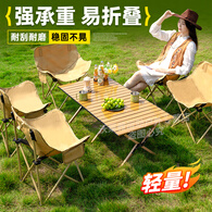 澜虞户外桌椅折叠便携式全套桌椅露营野餐蛋卷桌椅组合野营桌子折叠椅 60cm单桌+2个月亮椅 【浅木纹色】铁合金材质