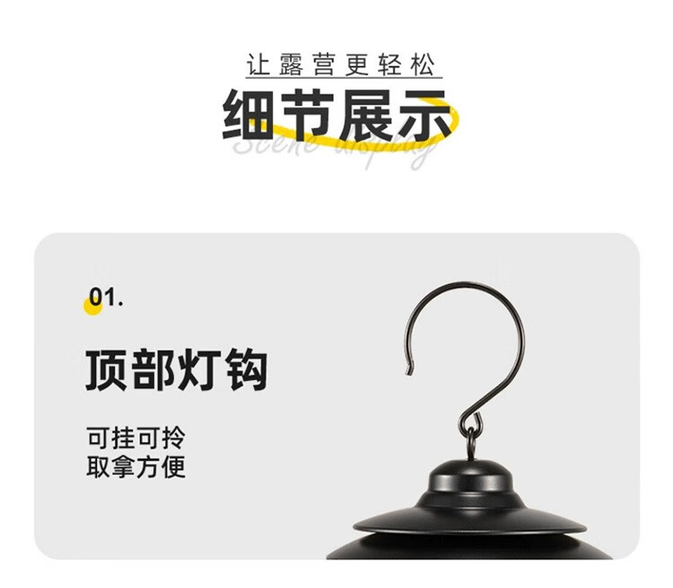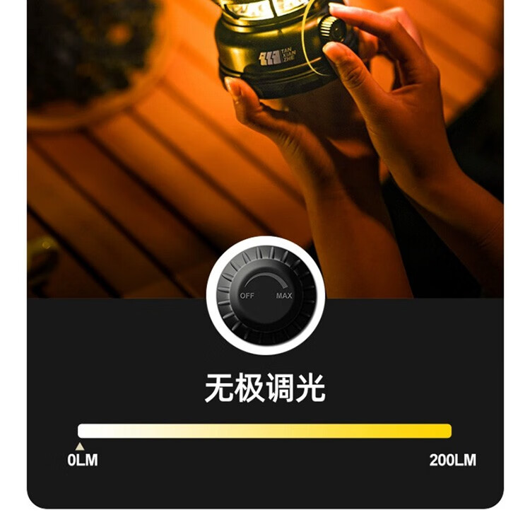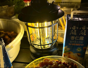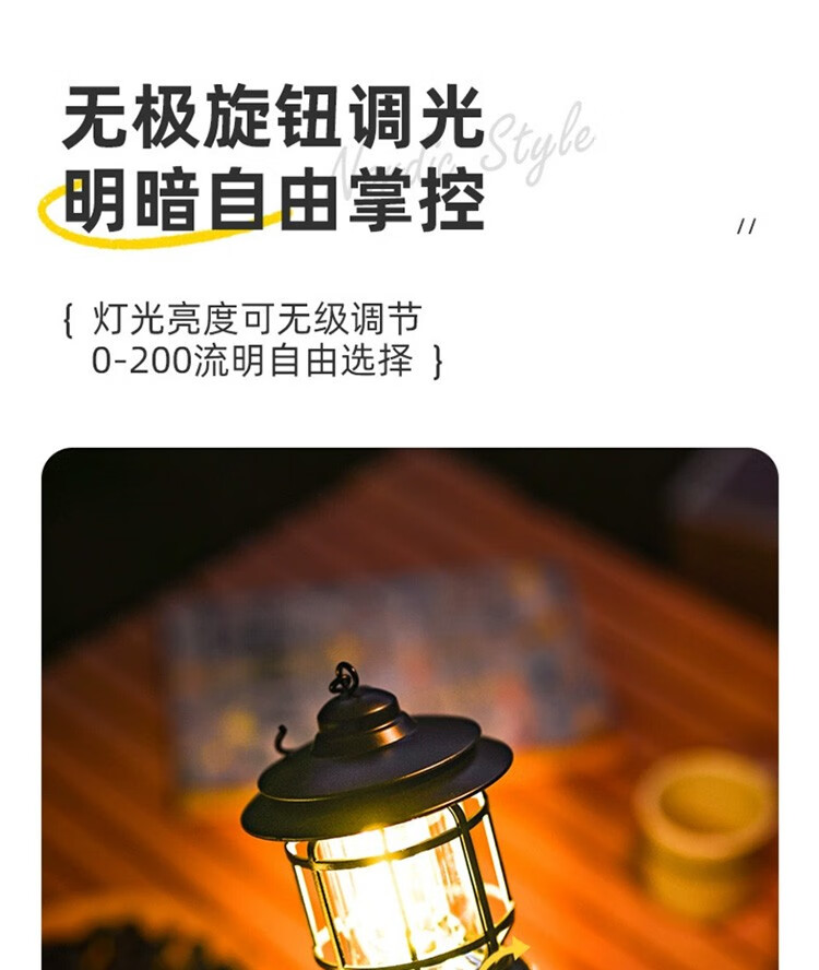 收到有几天了,露营灯颜值很高,旋钮可以无级调节亮度,上面还带有挂钩,感觉挺不错的,还没拿出去露营使用,估计露营拍照会很出片吧!