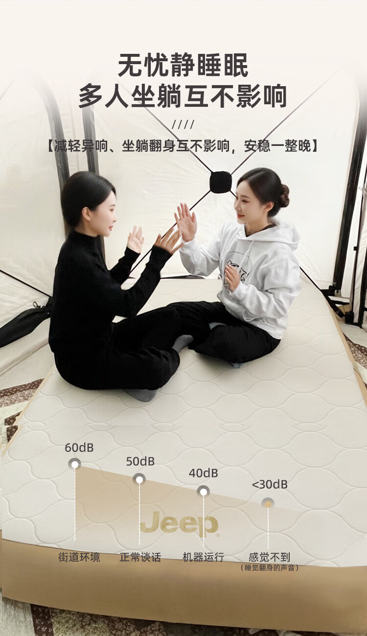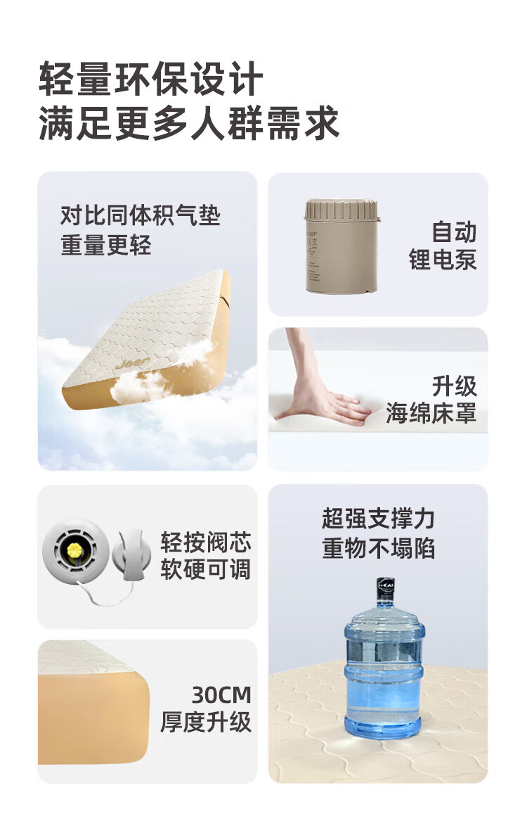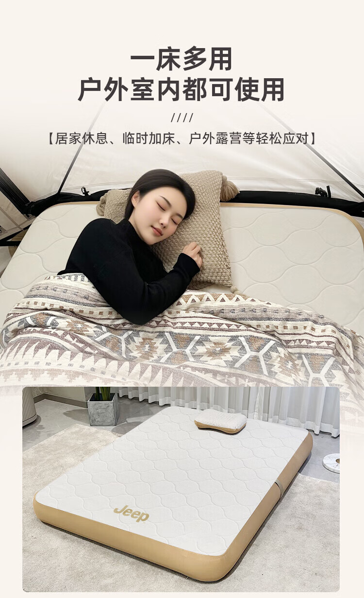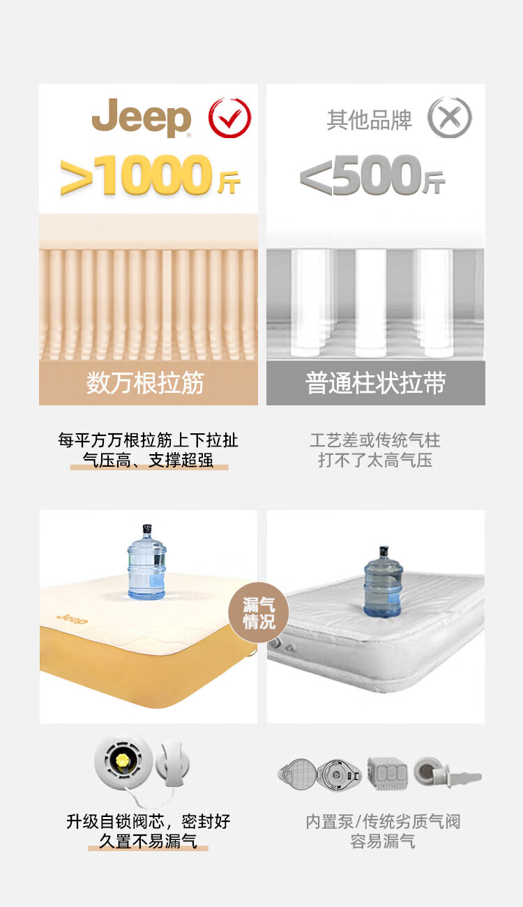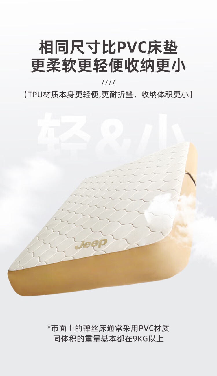 JEEP拉丝充气床垫打地铺家用户外露营便携式自动气垫床弹丝云床 拉丝床米色单人矮款+手动泵