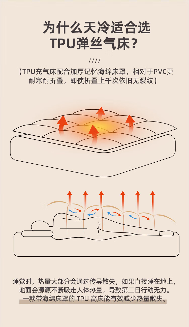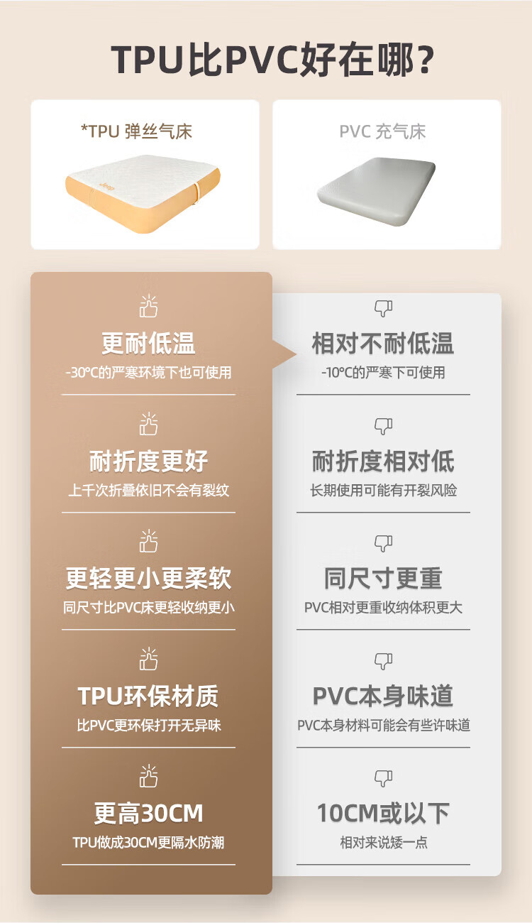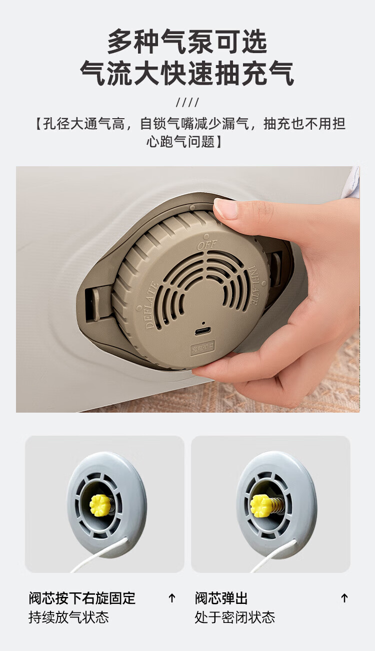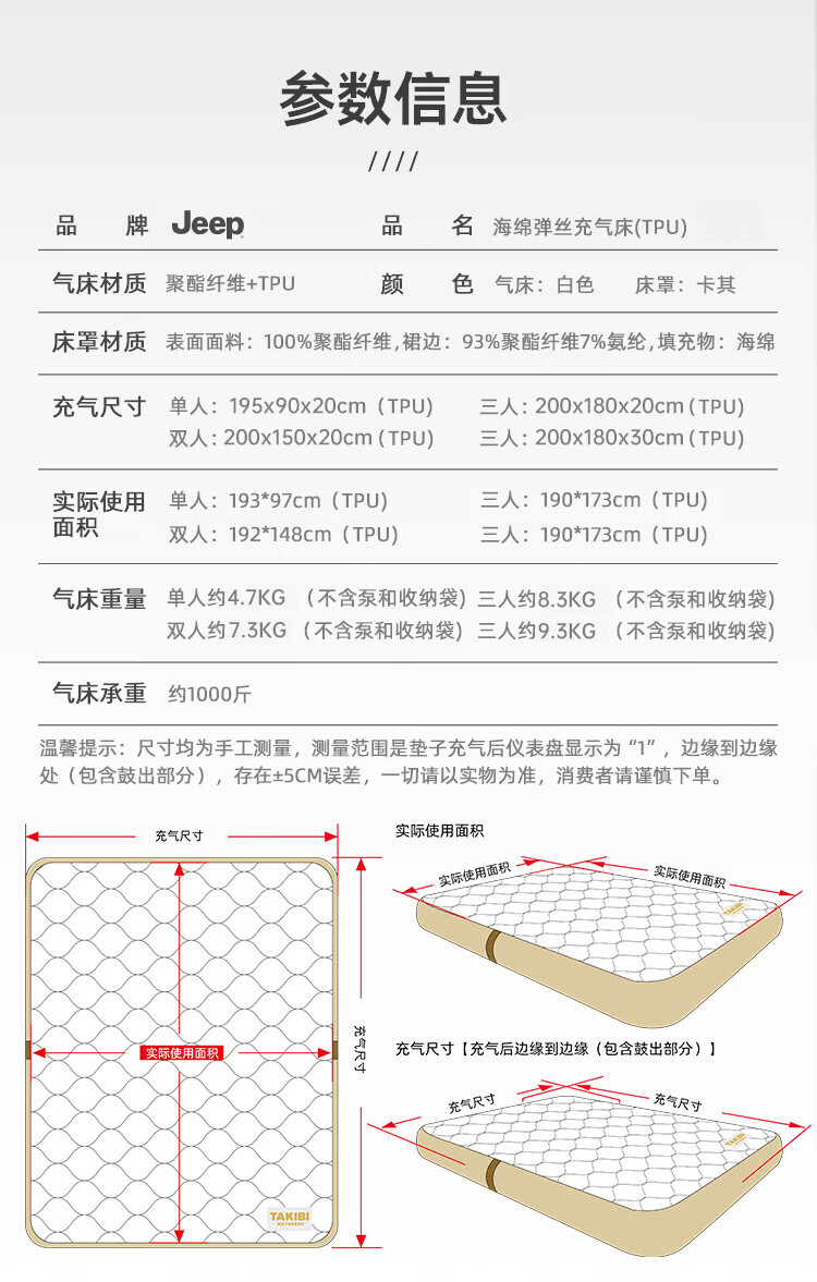 JEEP拉丝充气床垫打地铺家用户外露营便携式自动气垫床弹丝云床 拉丝床米色单人矮款+手动泵