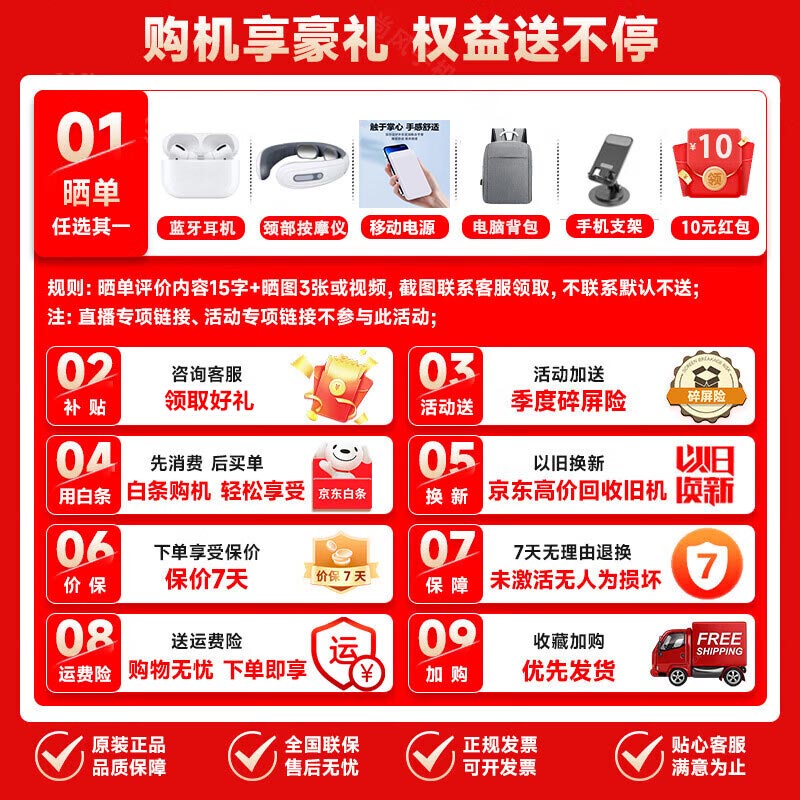 手机主机 / 电源适配器 / USB Type-C 数据线 / 插针 / 手机保护壳 / 说明书(含三包凭证)/ 屏幕保护膜(出厂贴在手机上)