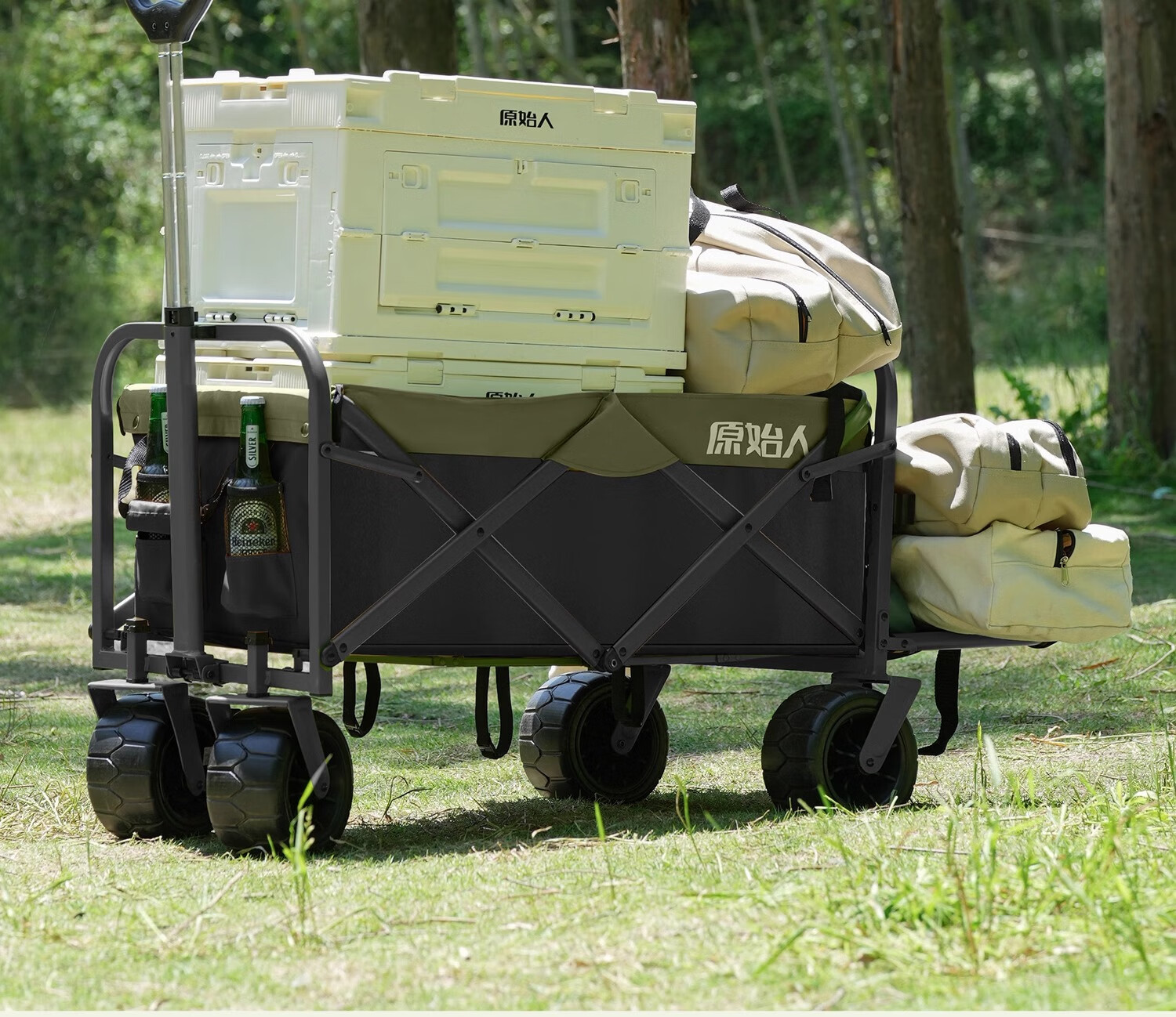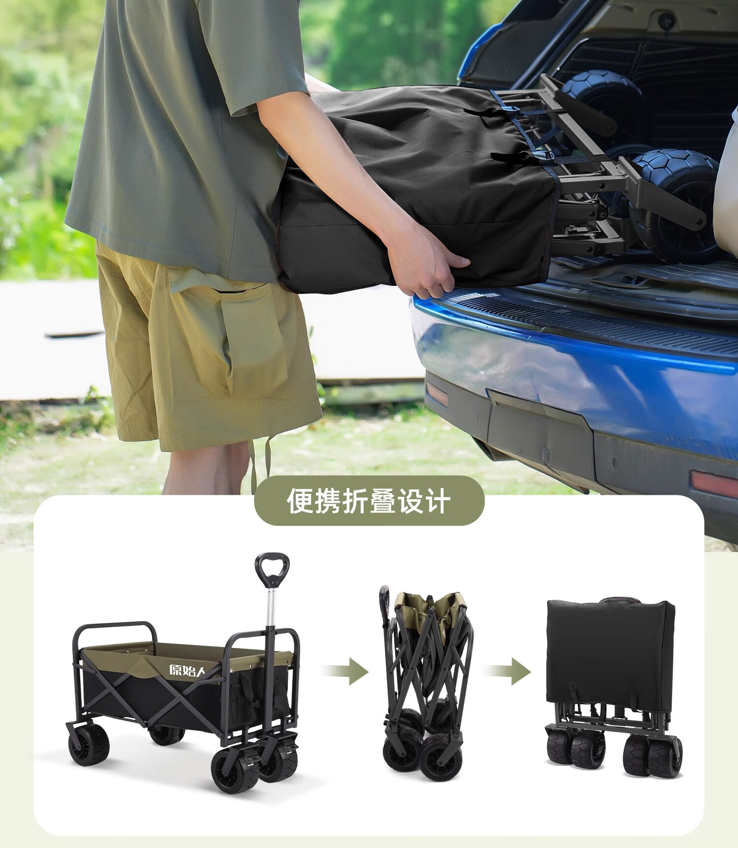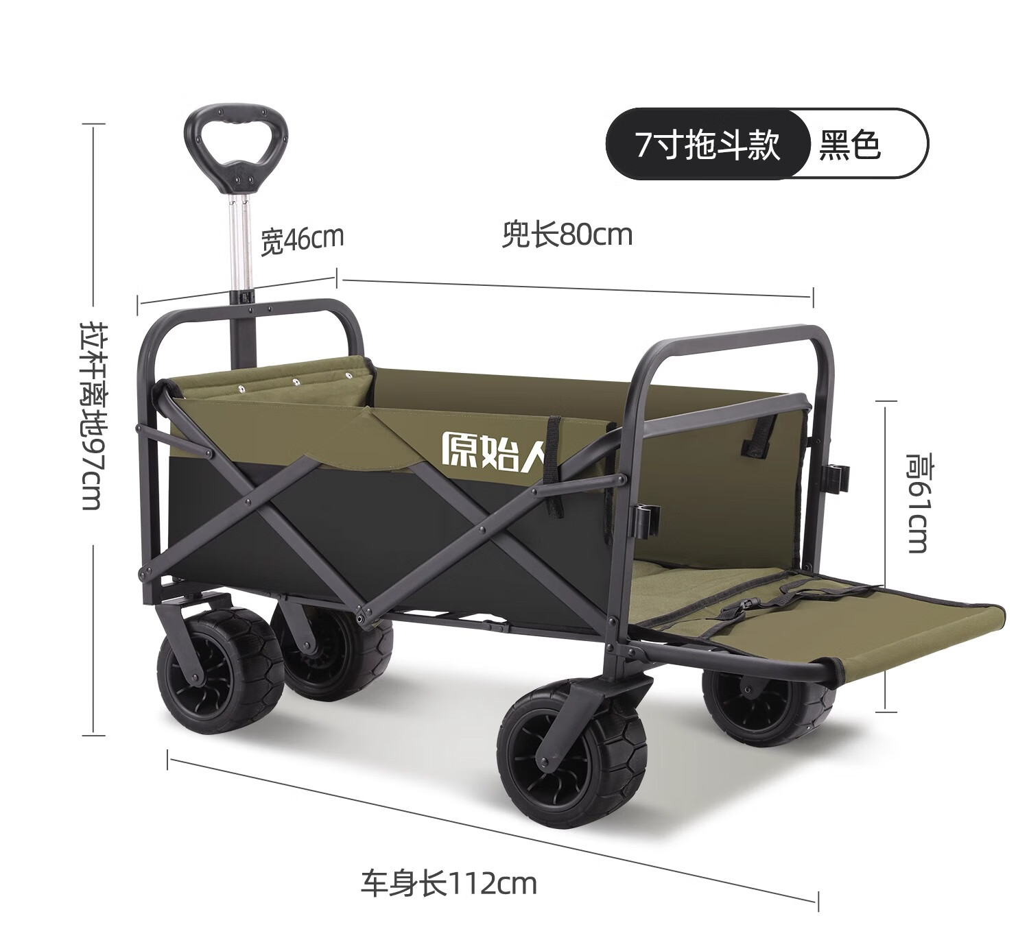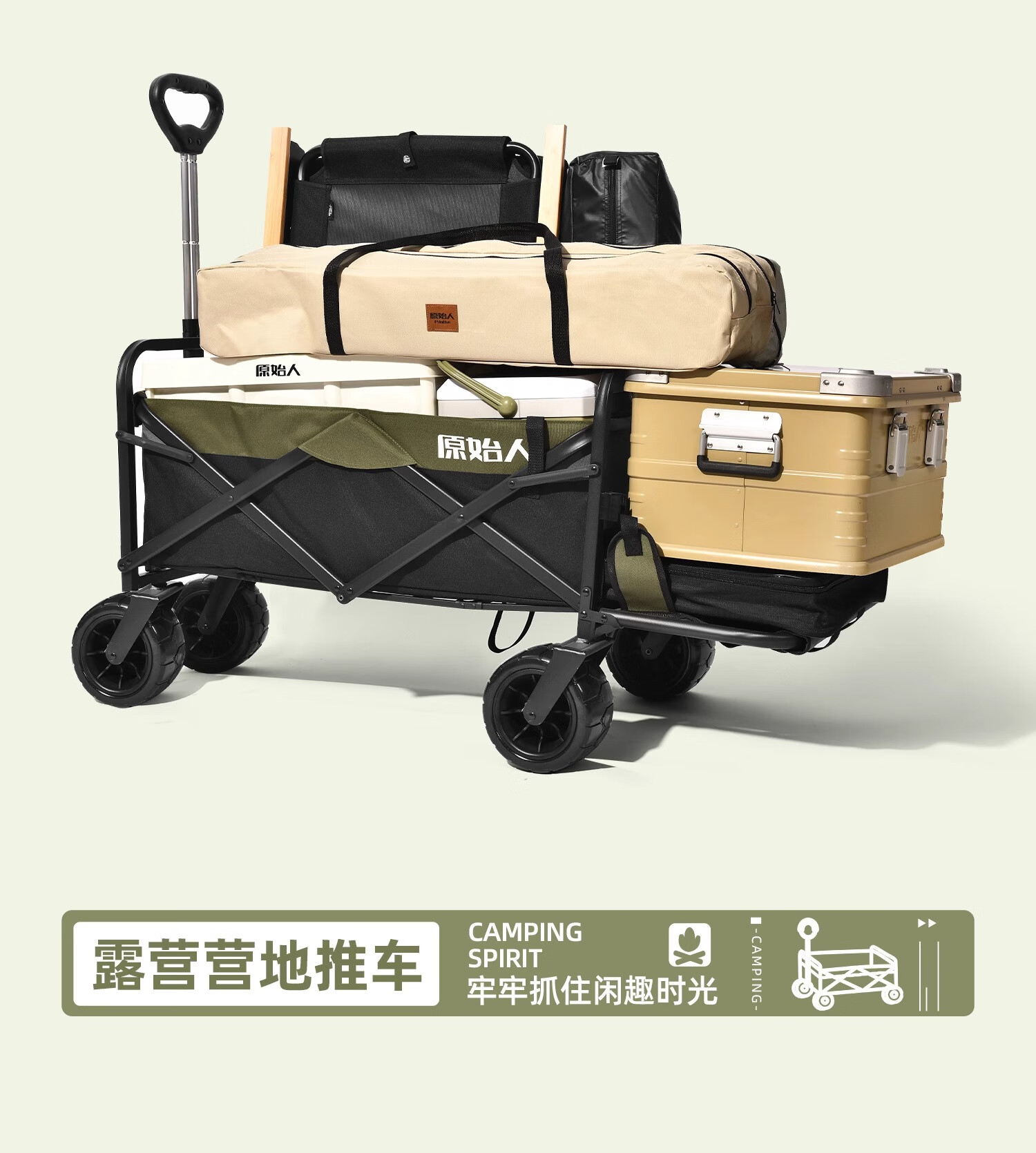 原始人露营车野餐户外折叠小推车可折叠手拉车遛娃郊游帐篷收纳桌板拖车 250L 堆叠容量【黑绿】加宽越野轮