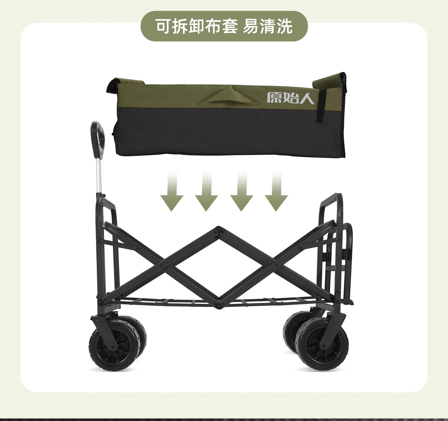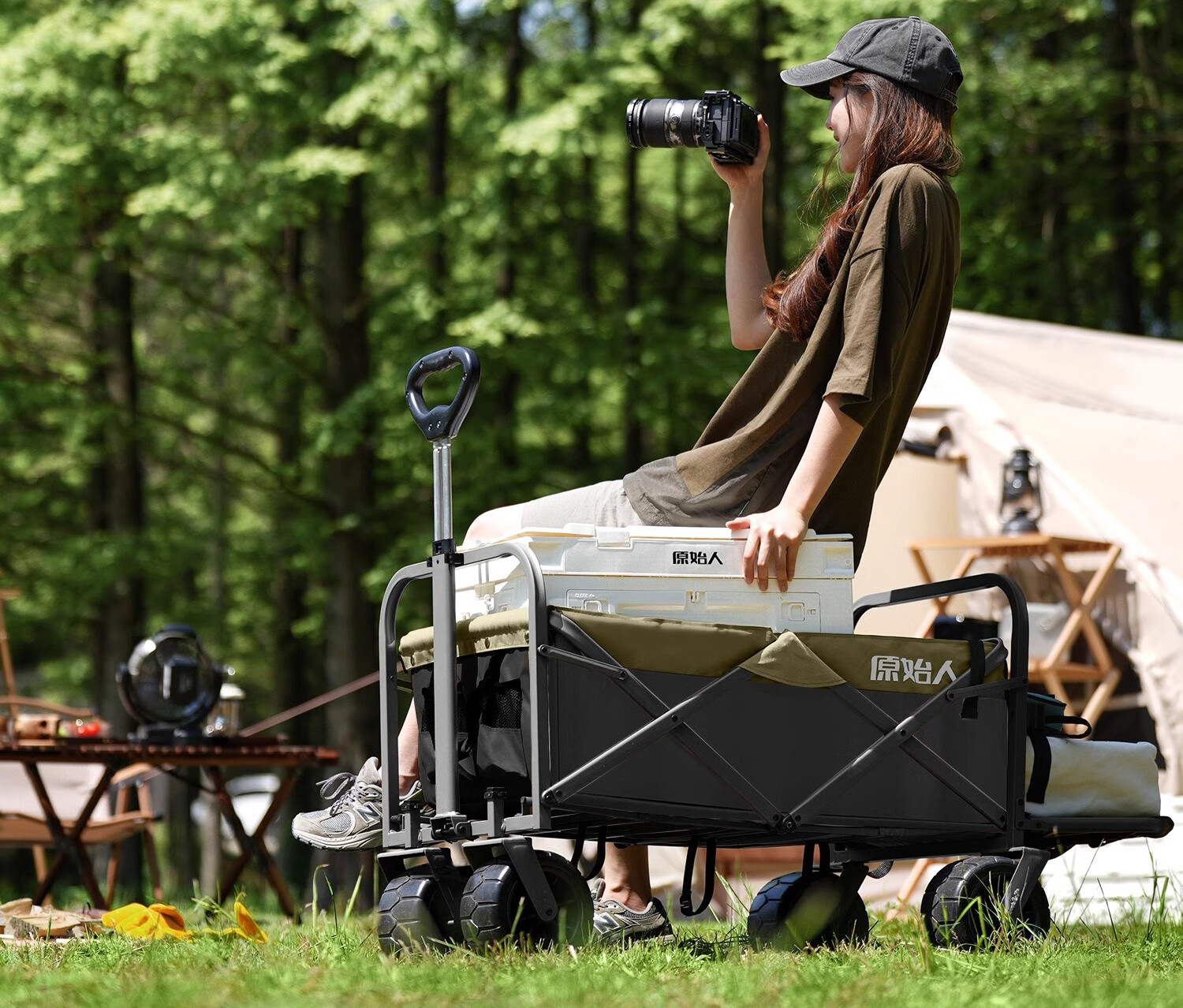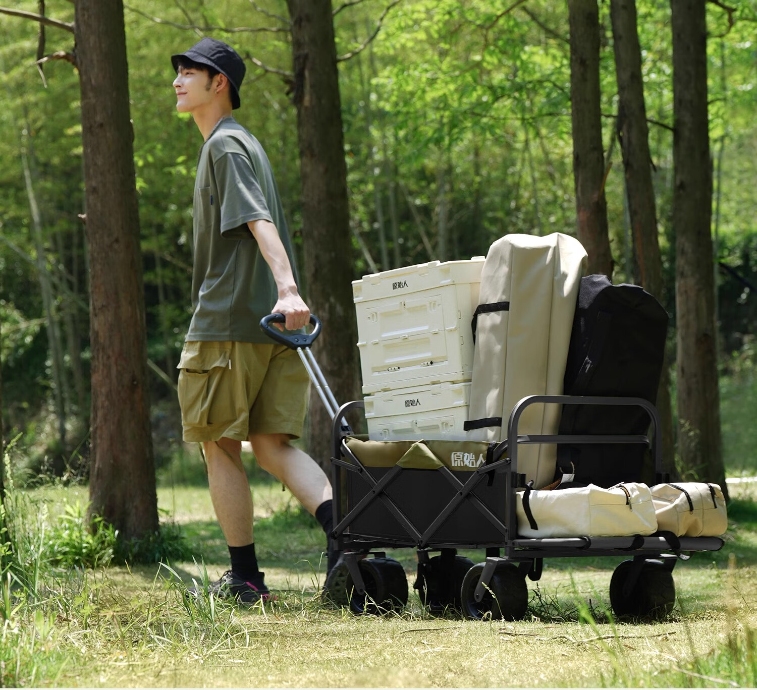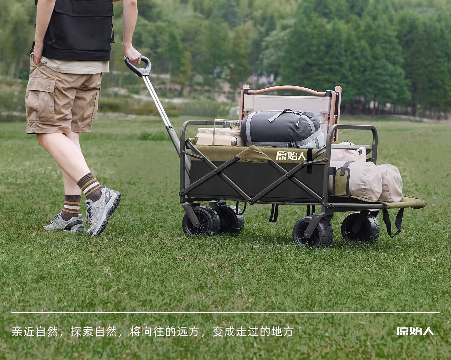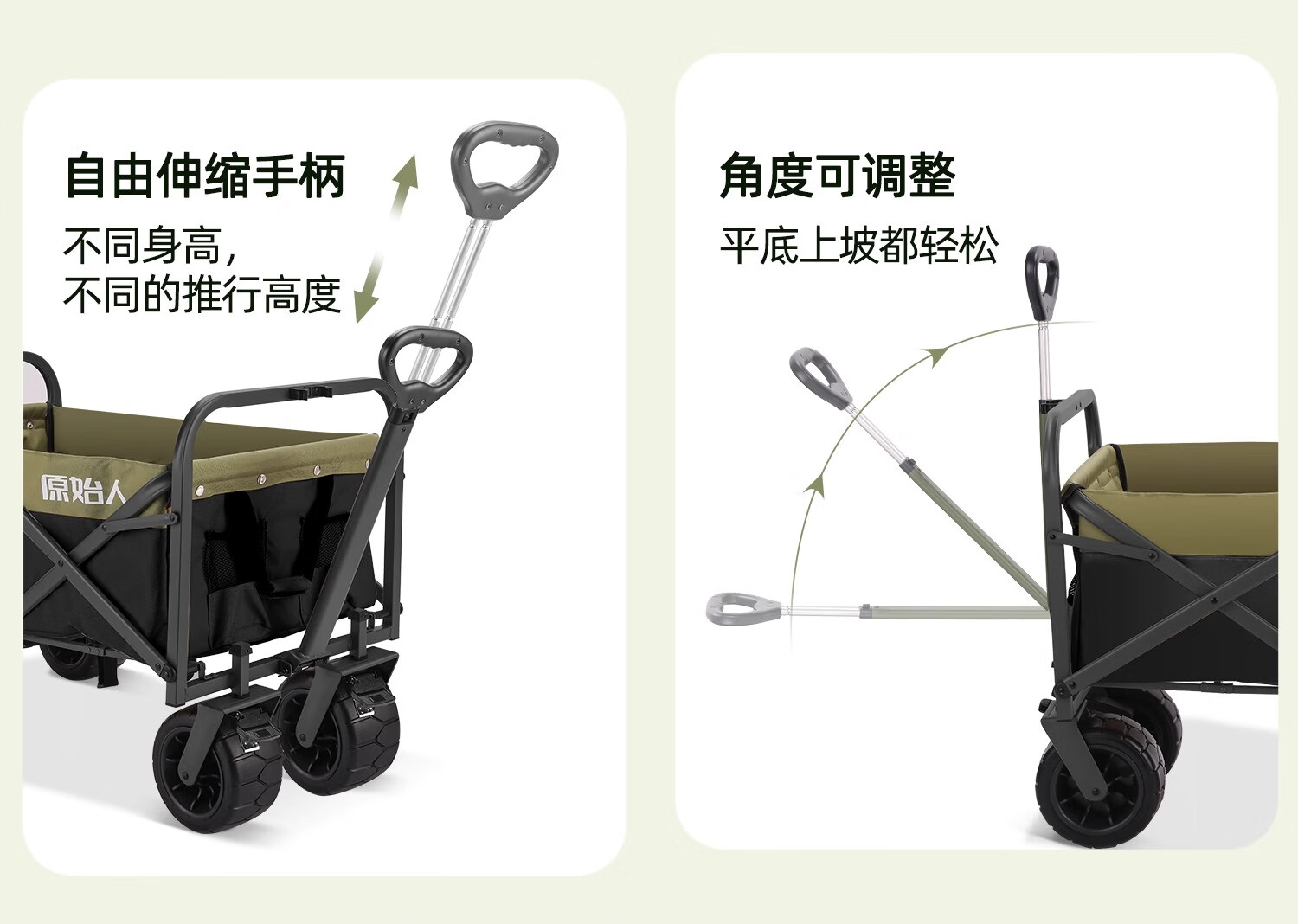 原始人露营车野餐户外折叠小推车可折叠手拉车遛娃郊游帐篷收纳桌板拖车 250L 堆叠容量【黑绿】加宽越野轮