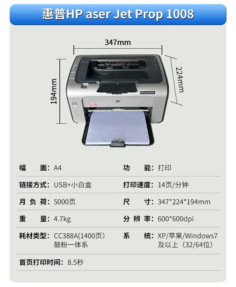 惠普HPP1007P1008P1106P1108黑白激光家用办公学生A4凭证医用打印机 打印机硒鼓