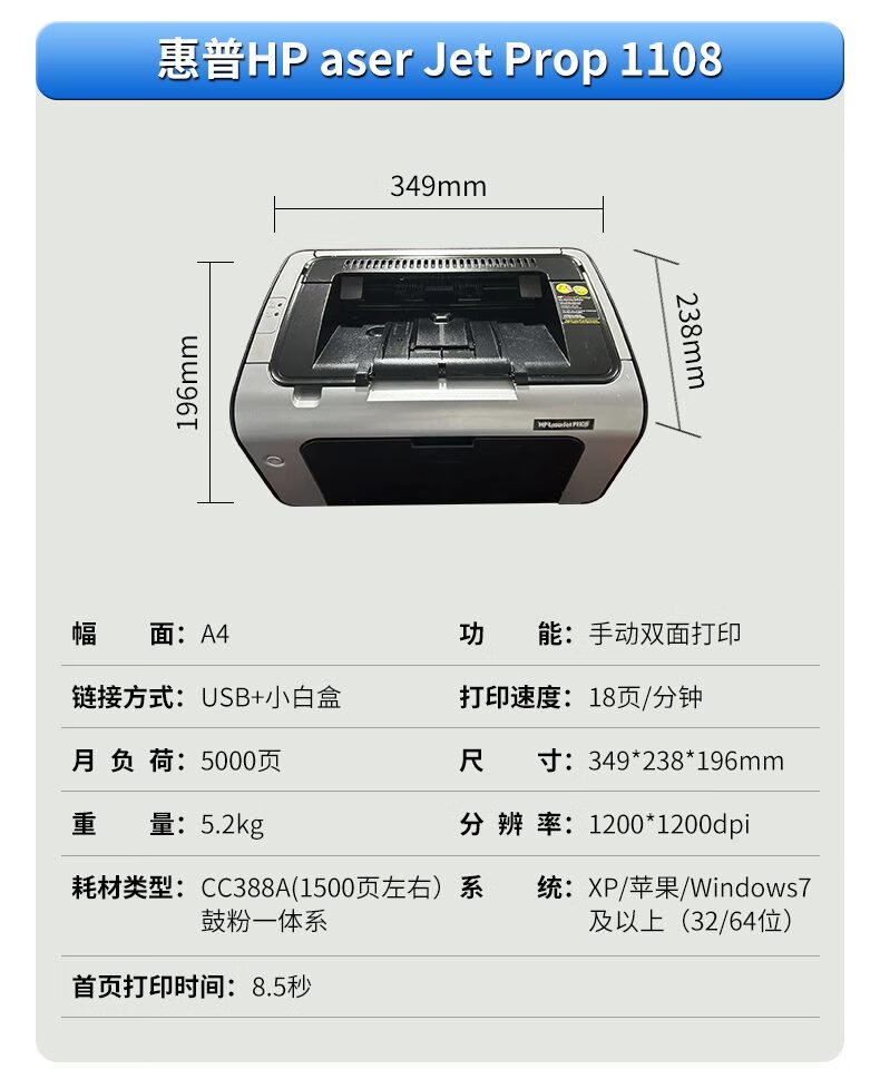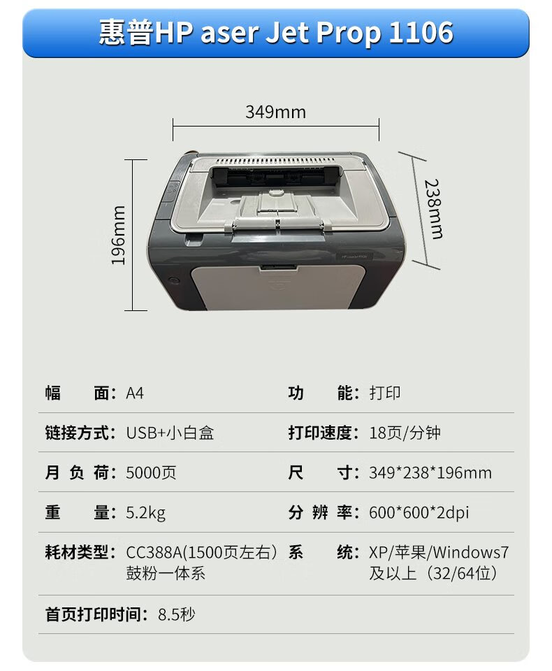 黑白激光打印机hp226dn/1108A4凭证办公家用学生小型激光打印 惠普1020 可循环加粉单打印机 8成新