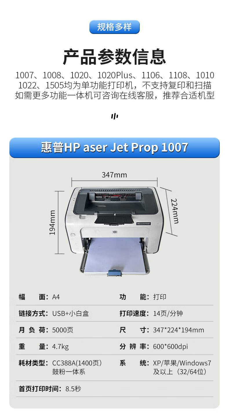 hpHP1007黑白激光打印机 A5凭证学生打印作业 办公家用打印机A4打印 9.9新hp1007不带硒鼓